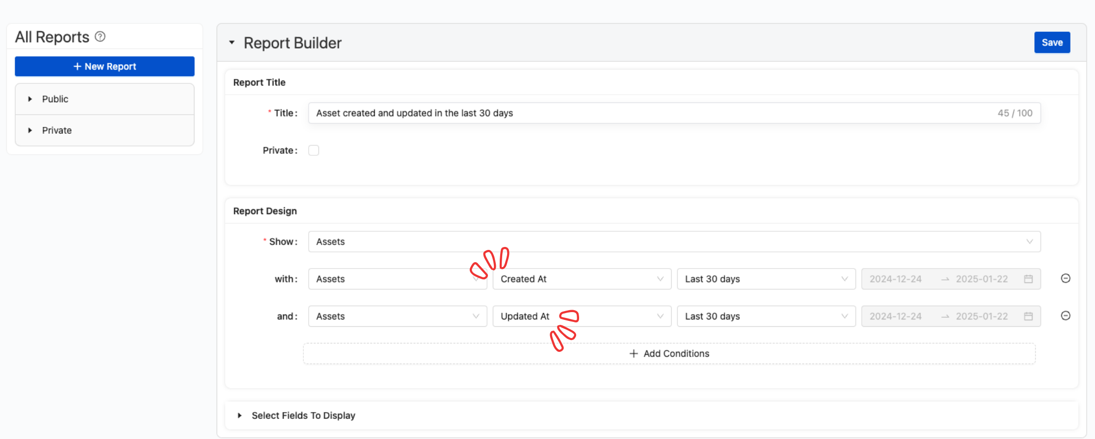 Use CreateAt and UpdateAt conditions in the Report Builder for more refined, accurate reports.