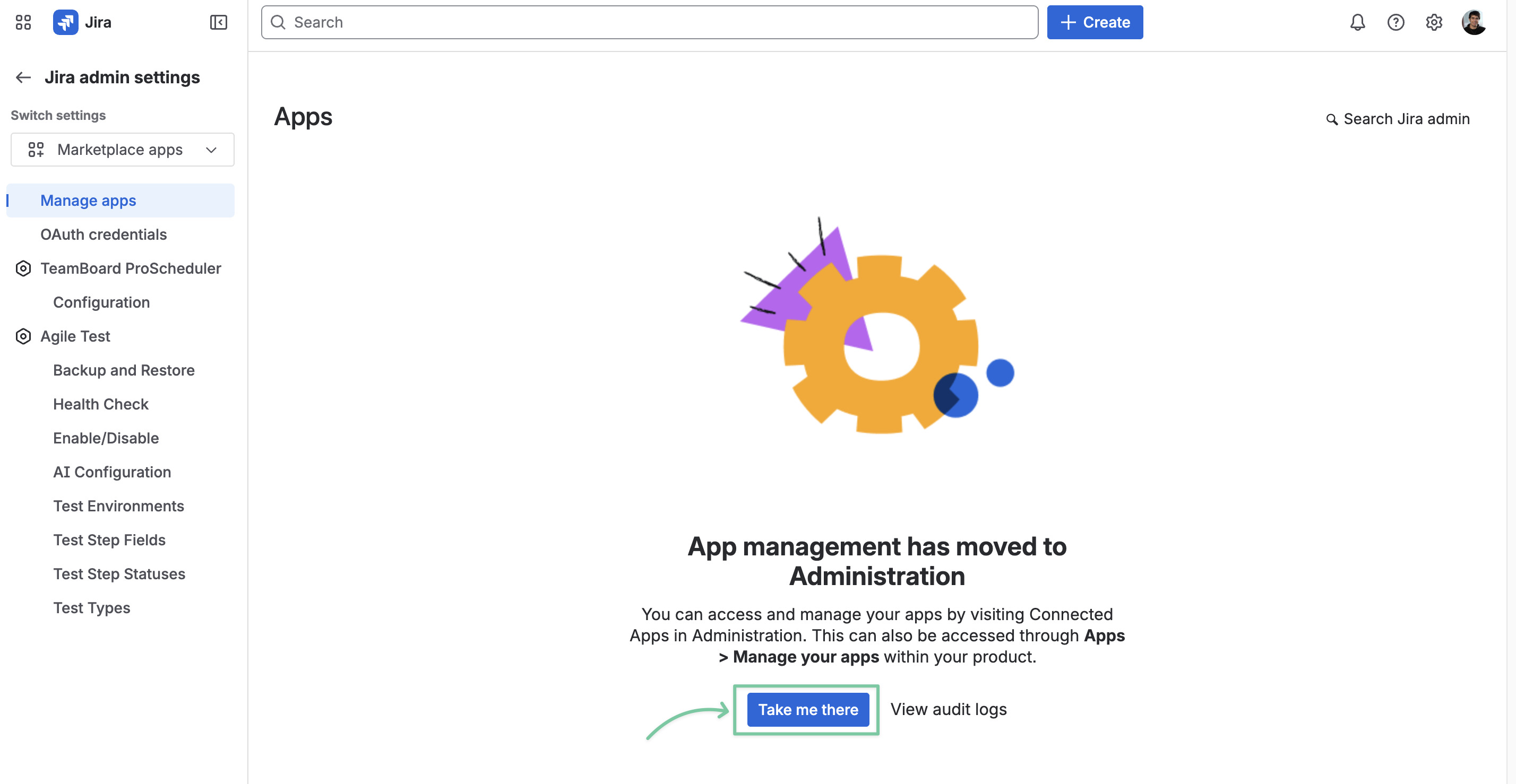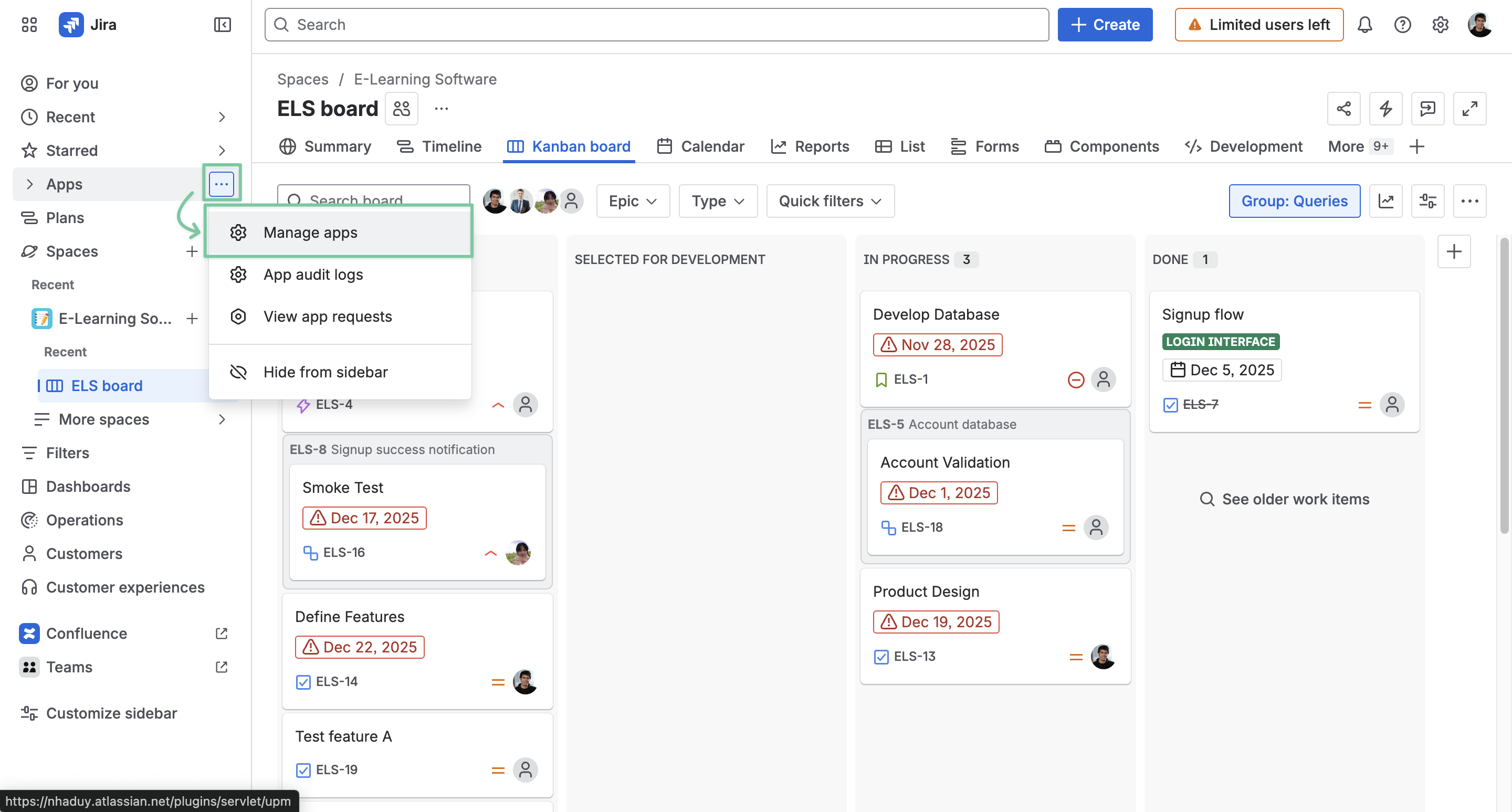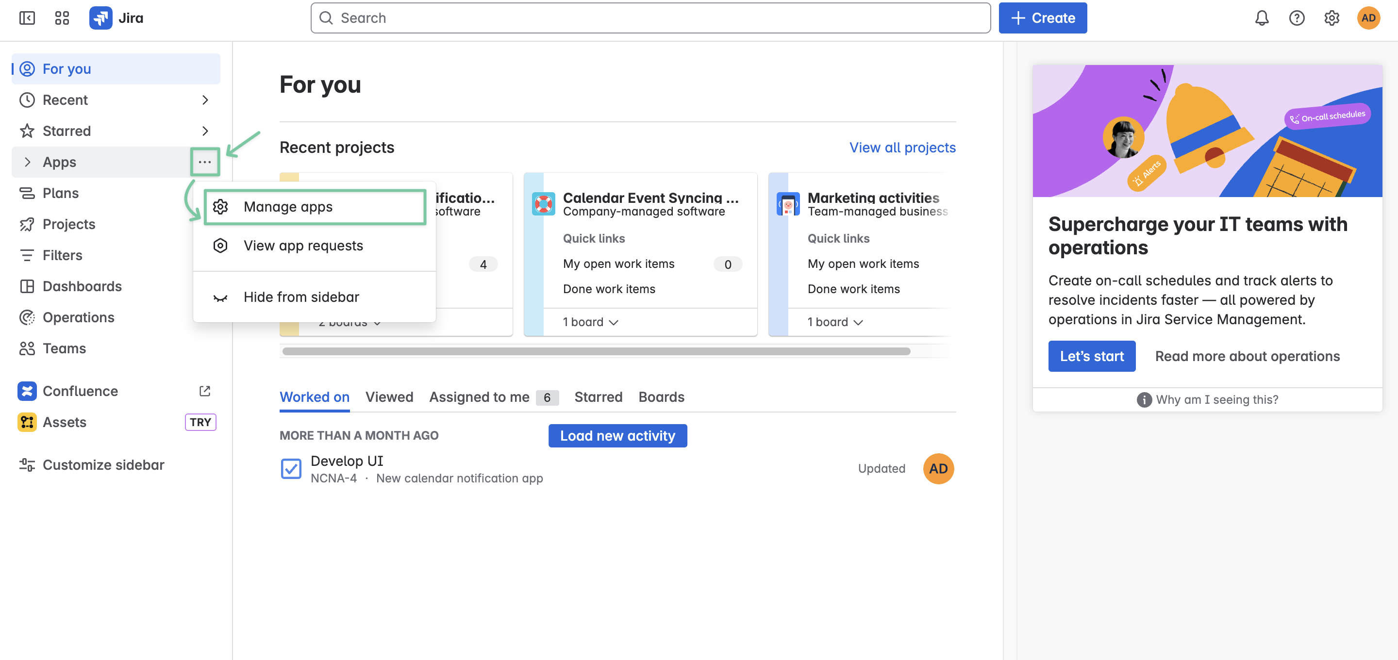 From your Jira dashboard, locate the App tab in the left sidebar menu and click the three-dot symbol for More actions. Then, choose ⚙️ Manage apps.