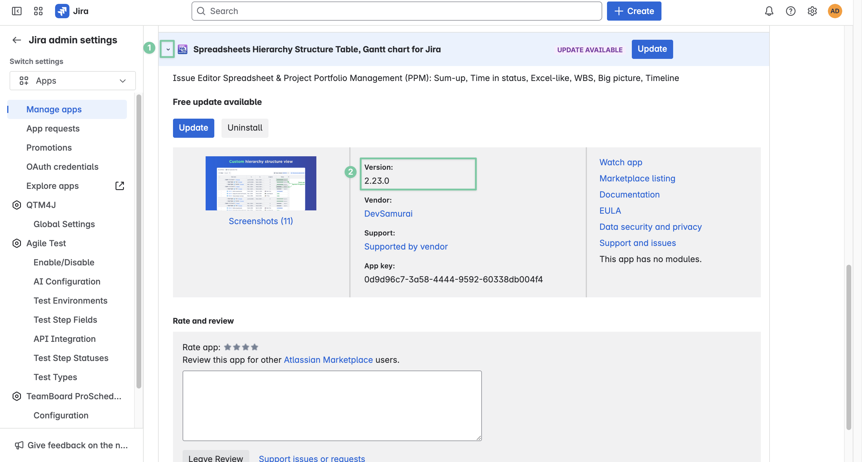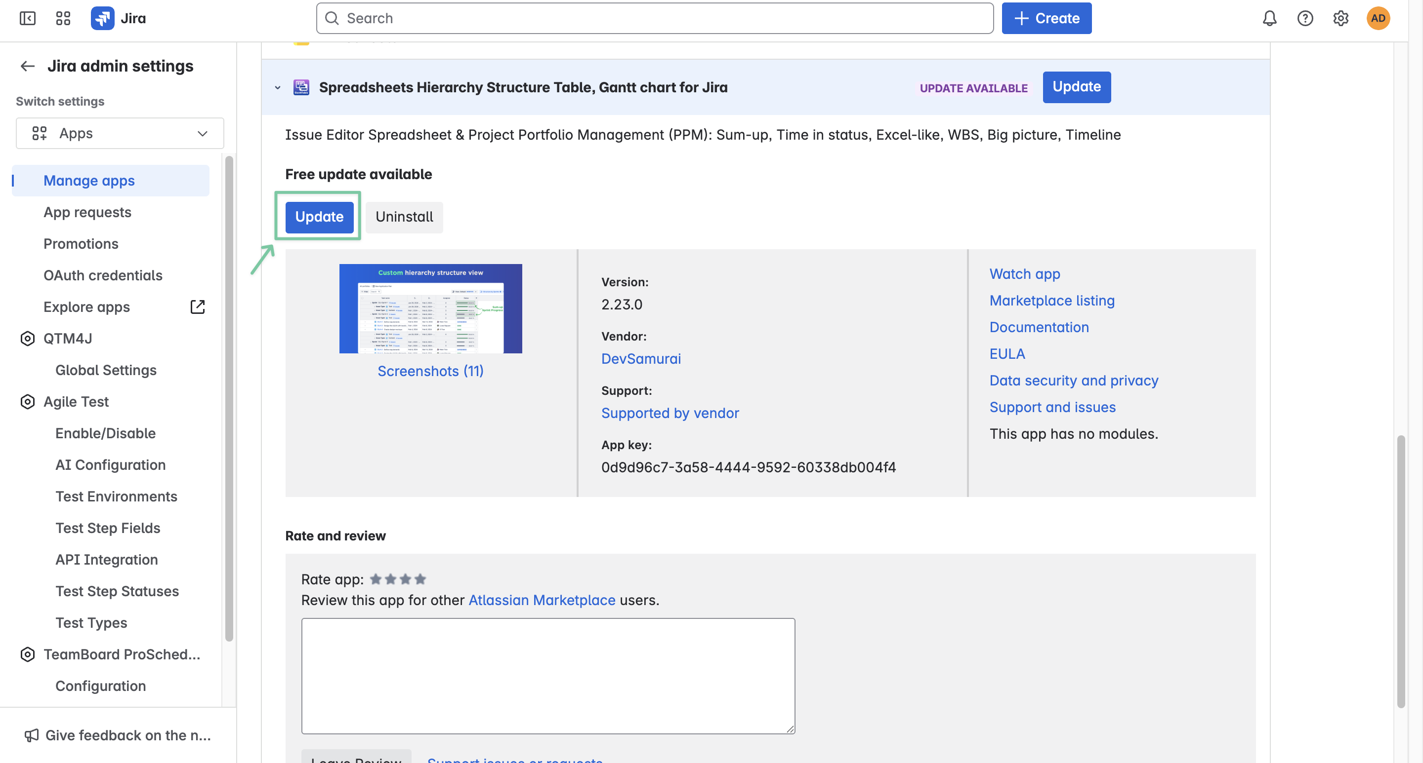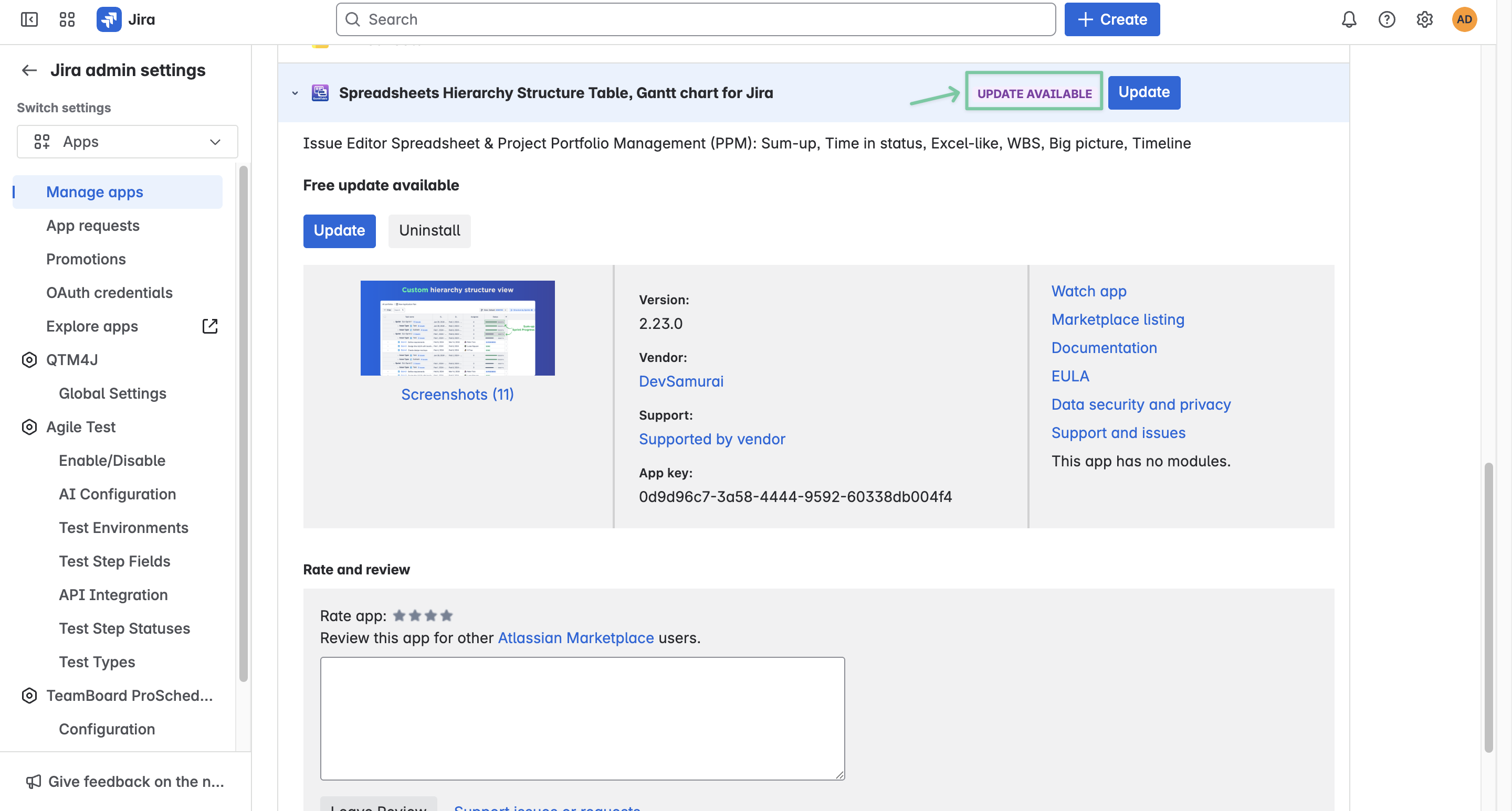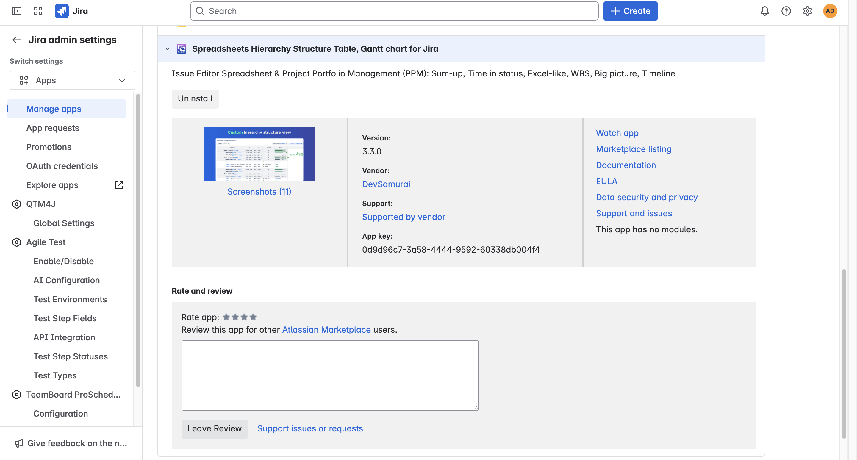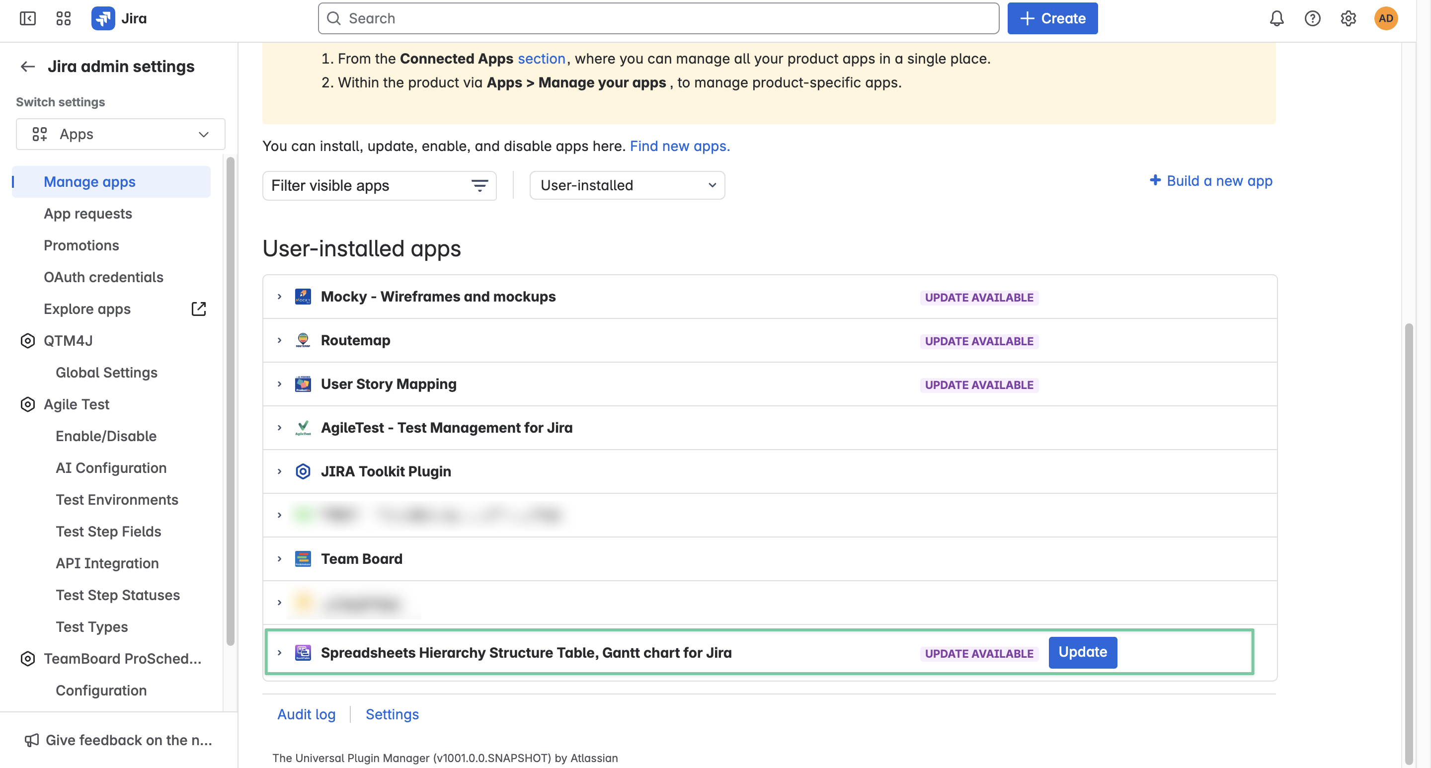 Scroll down to the User-installed apps section, find GanttTable - Spreadsheets Hierarchy Structure Table, Gantt chart for Jira.