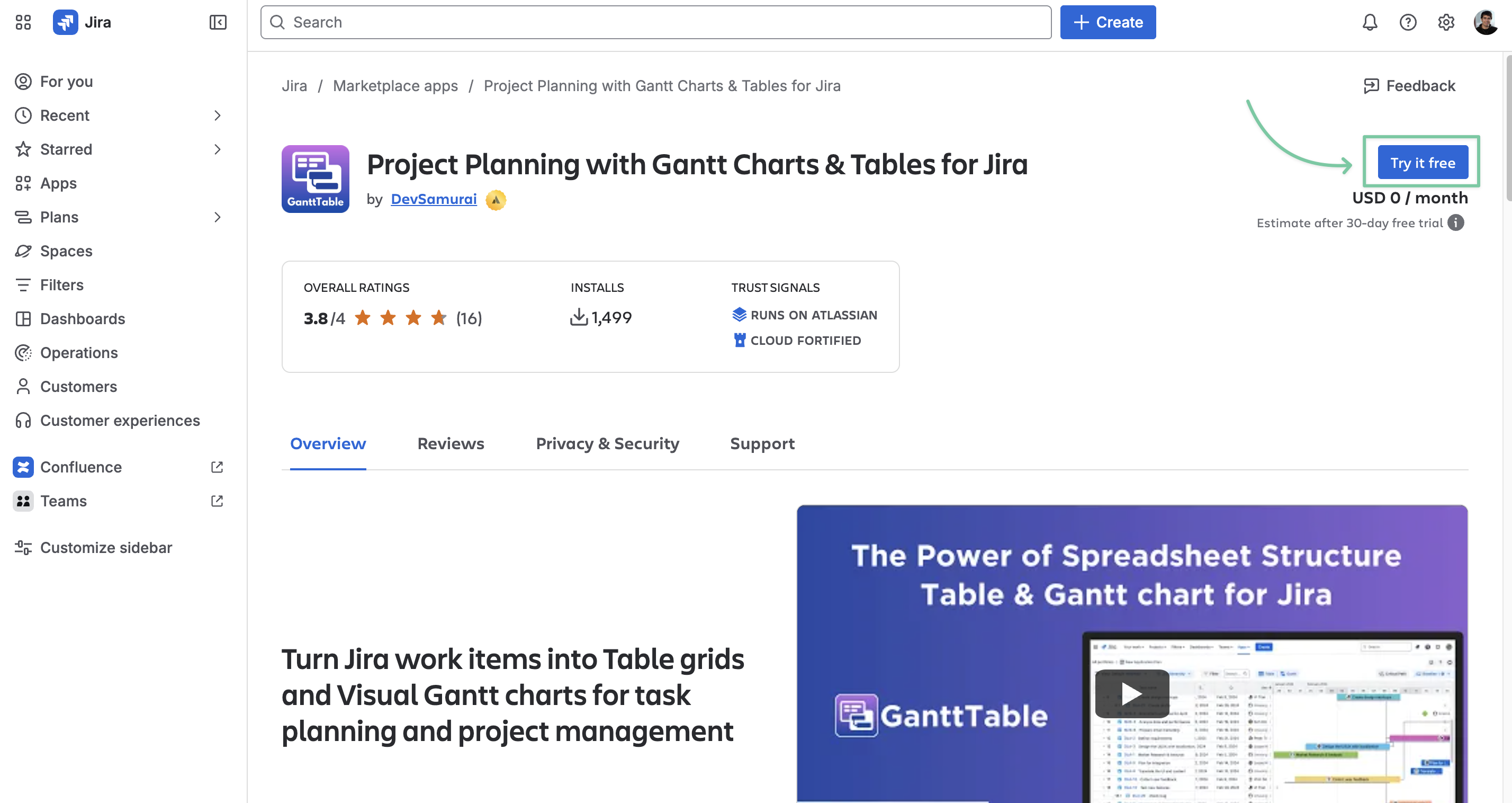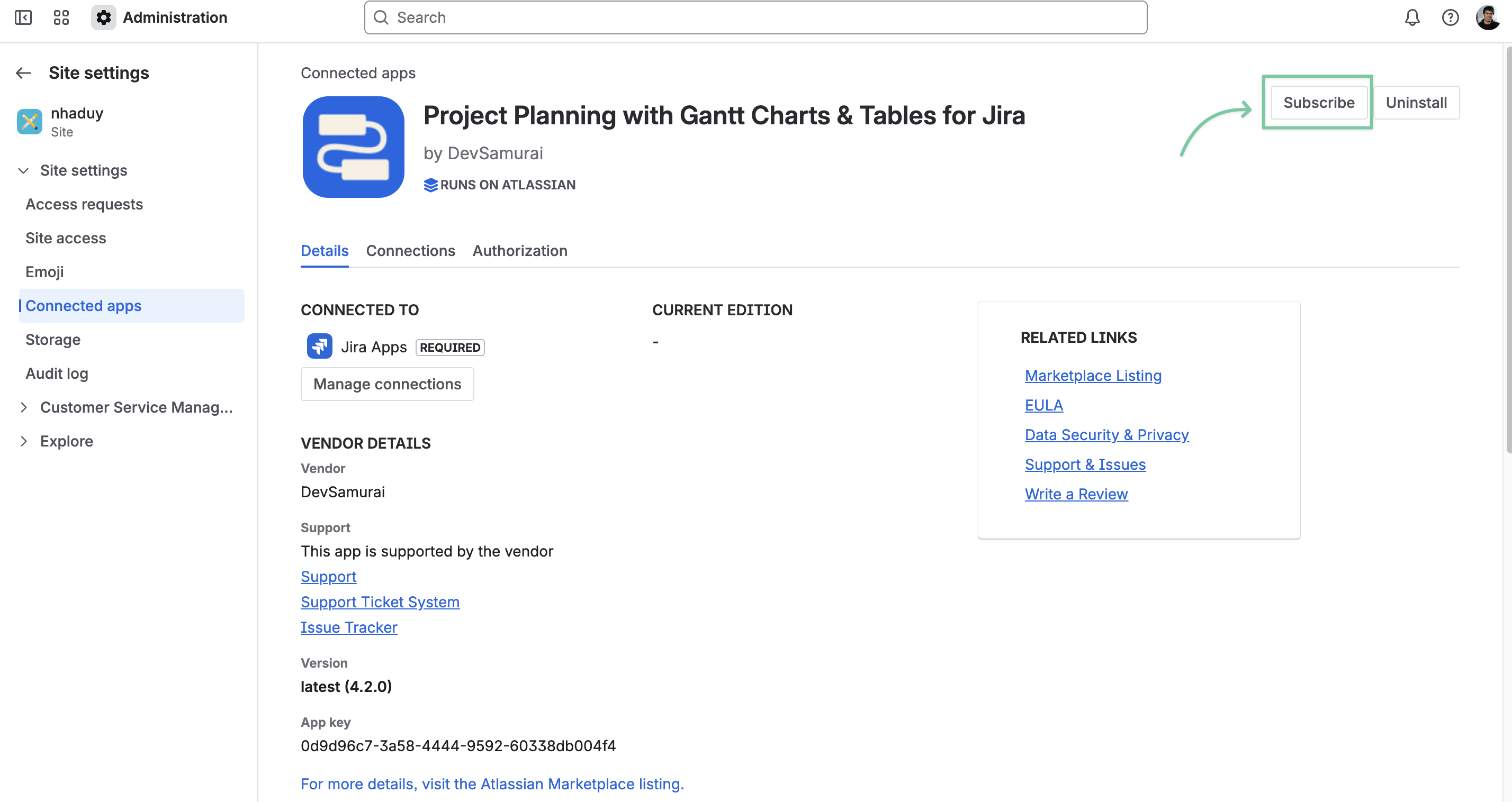 After clicking the Subscribe button, you will be redirected to the Atlassian Marketplace page. You can click Try it free to start the 30-day trial.