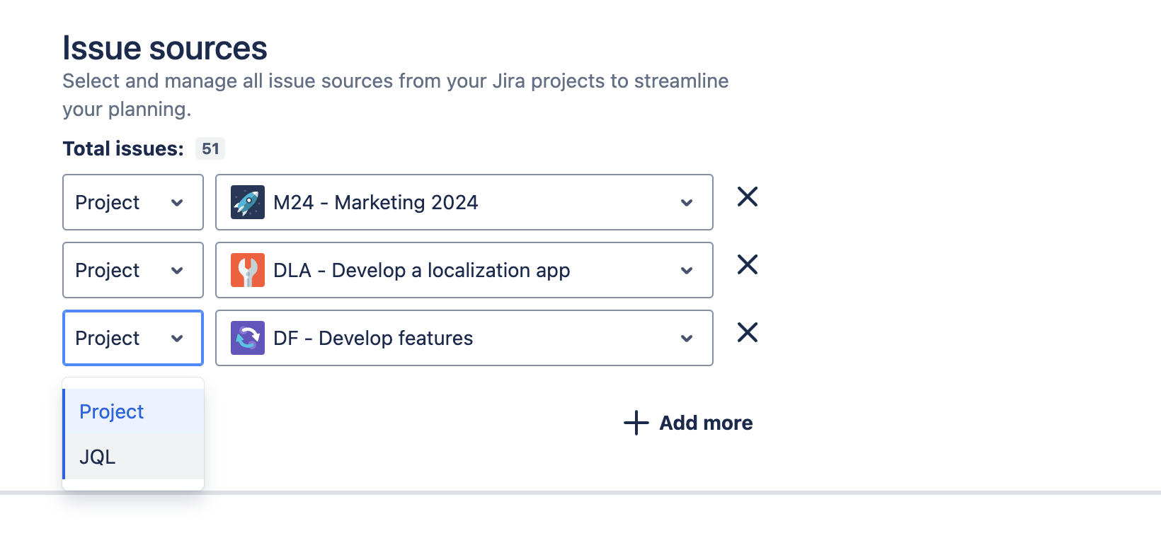 While adding more issue sources, you can either choose to use Project or JQL to search for the source you want.