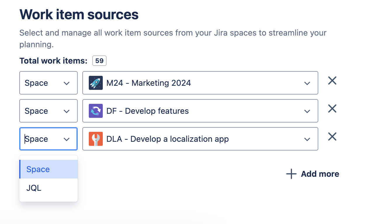 While adding more issue sources, you can either choose to use Space or JQL to search for the source you want.