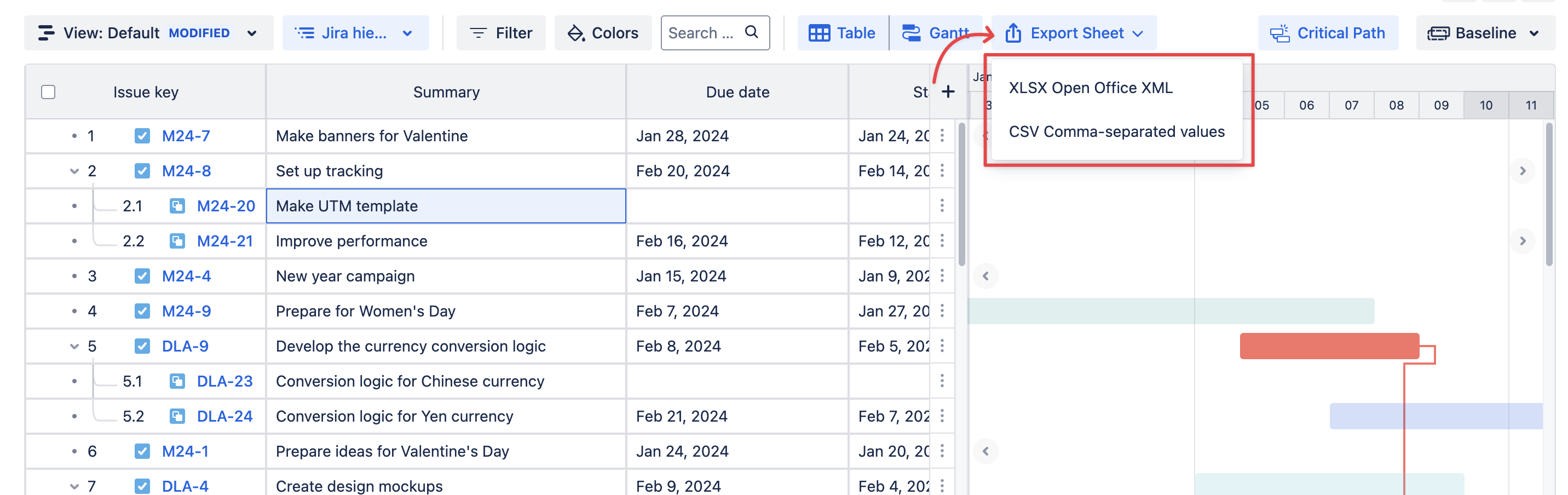 GanttTable supports exporting Jira issues and tickets as a data sheet.