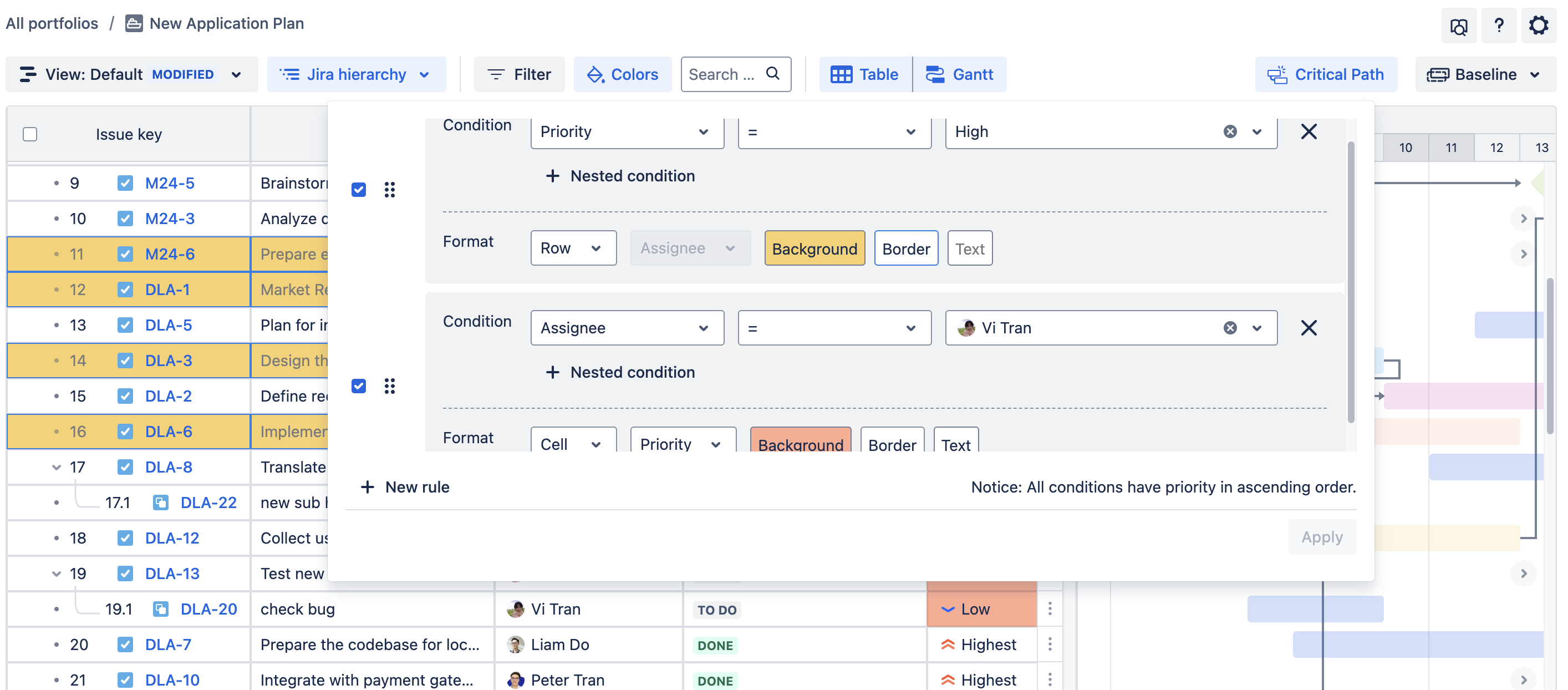 However, keep in mind that all condition rules will have priority in ascending order. In other words, the first color condition on the list will be prioritized to avoid overlapping.