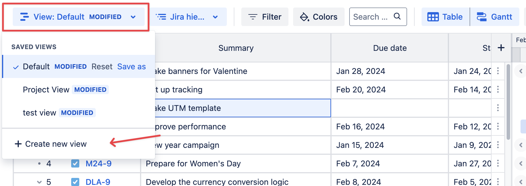 Keep in mind that when creating a new view, it will have the same filters and settings as your currently selected view in GanttTable.