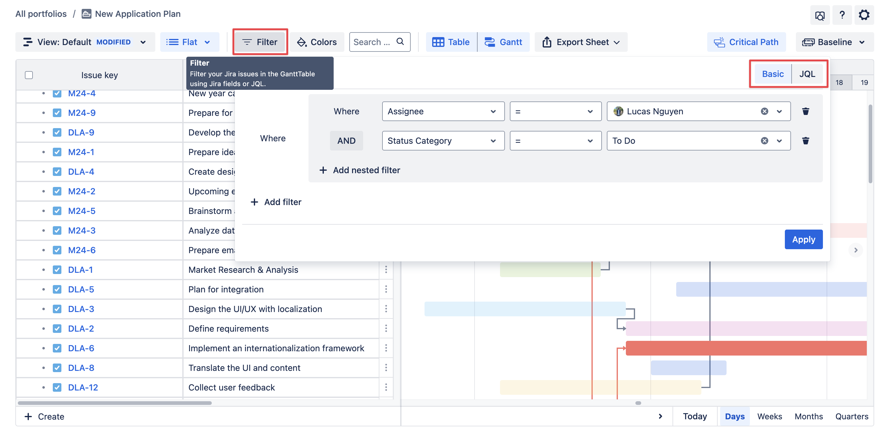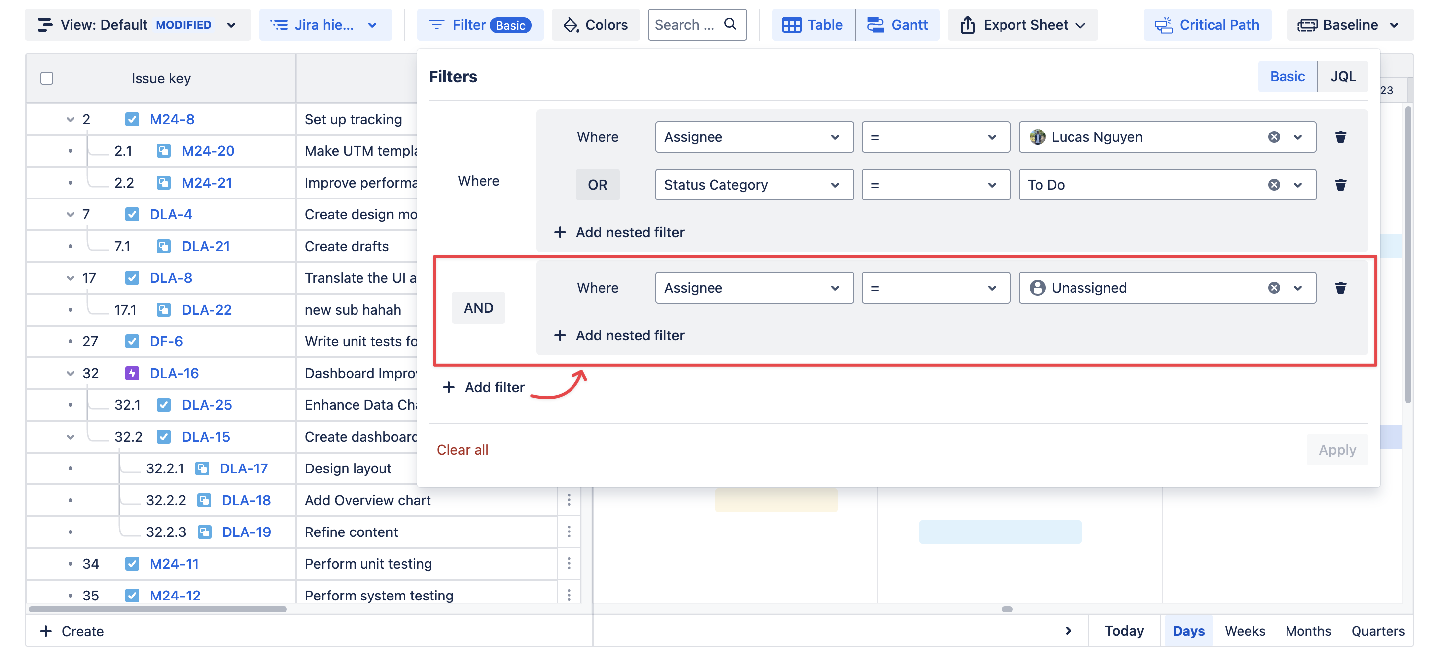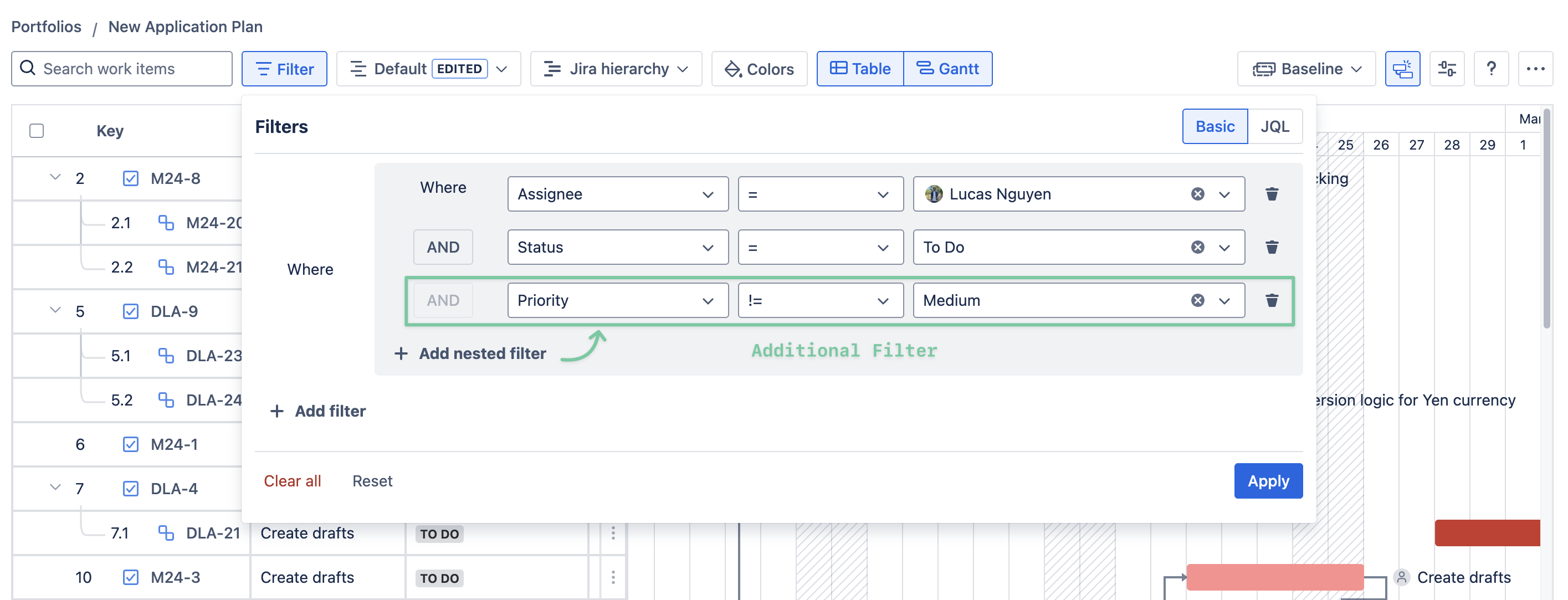 Currently, the Filter feature uses either Basic or JQL. For example, you can fill in the JQL filter box with assignee=… AND priority=… to filter Jira issues from a specific member with a certain level of priority.