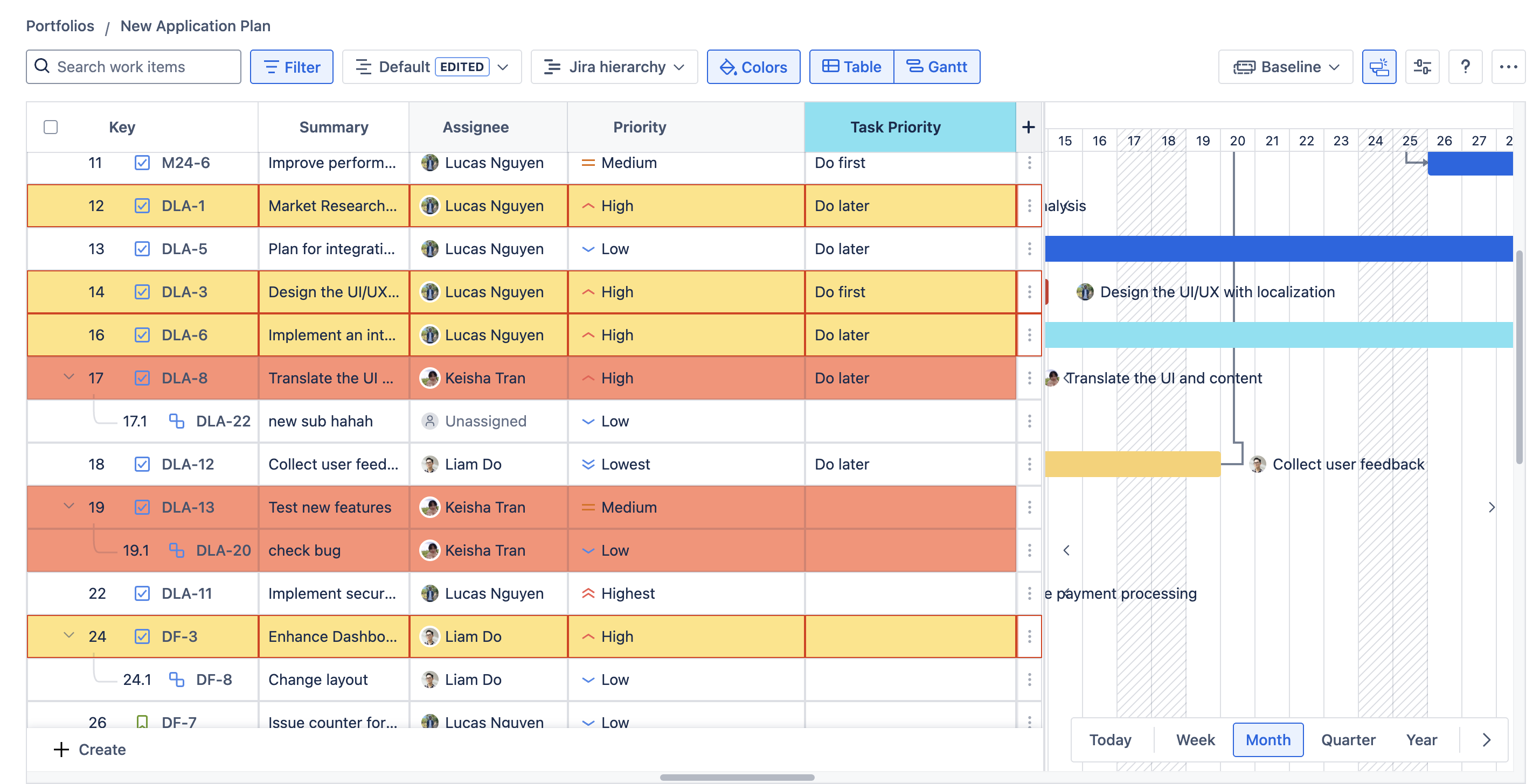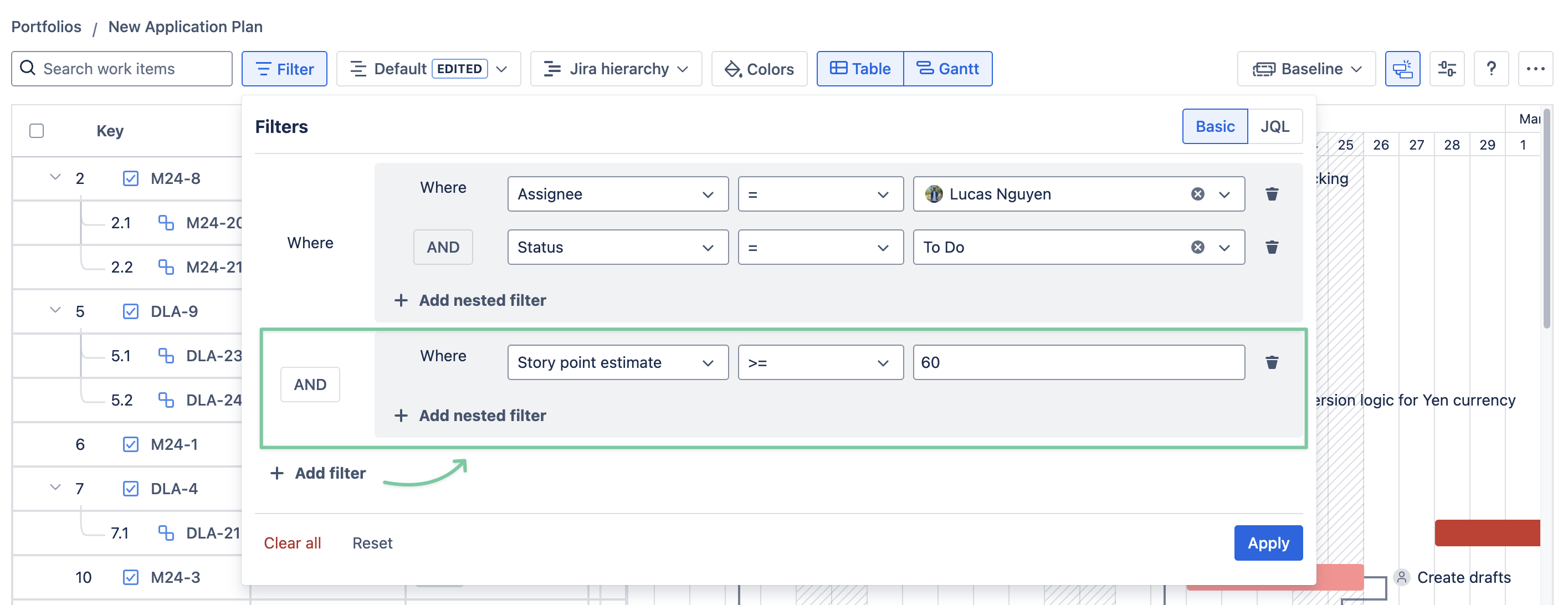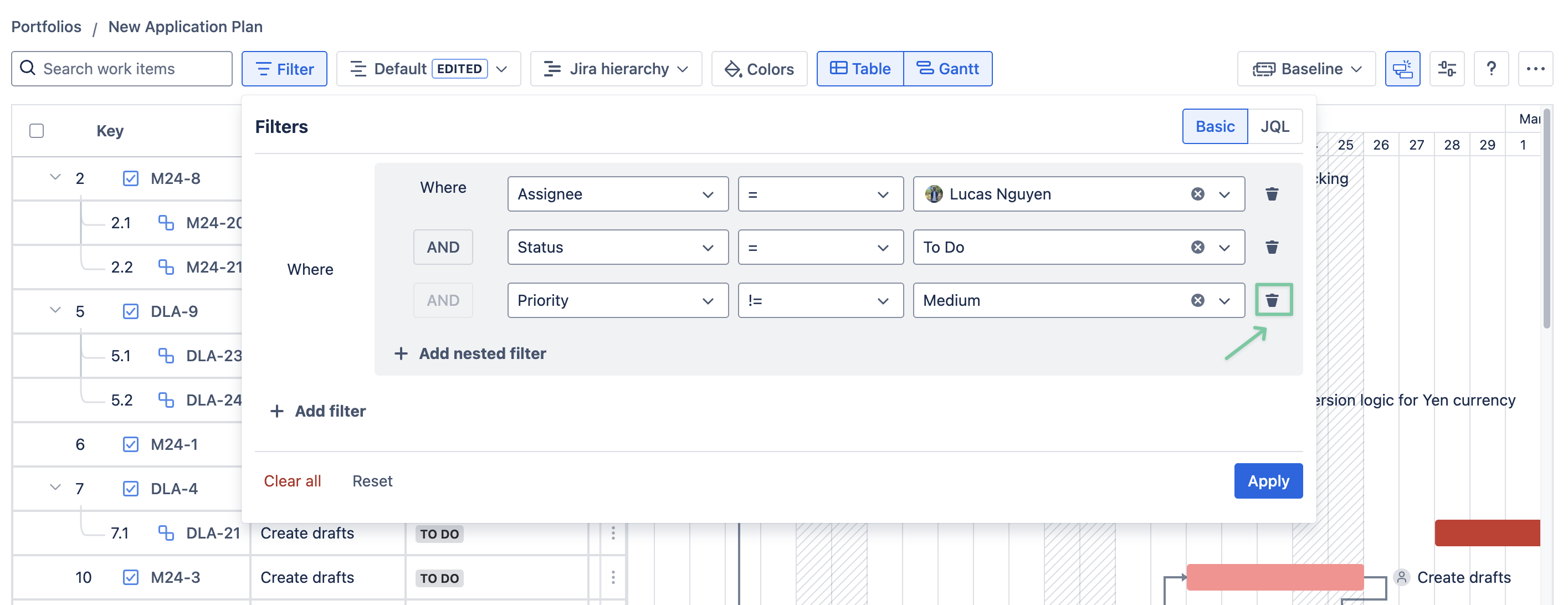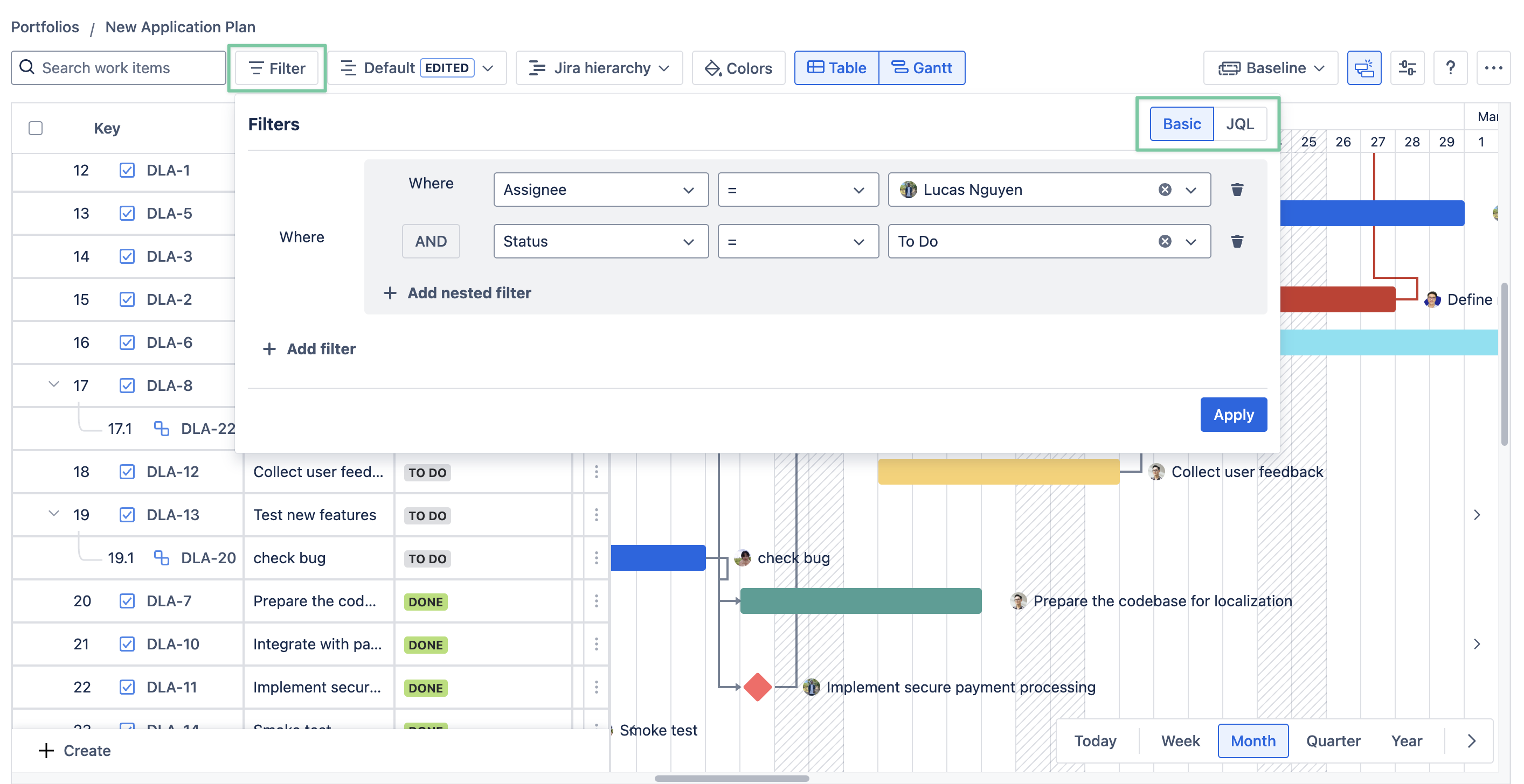 Currently, the Filter feature uses either Basic or JQL. For example, you can fill in the JQL filter box with assignee=… AND priority=… to filter Jira issues from a specific member with a certain level of priority.