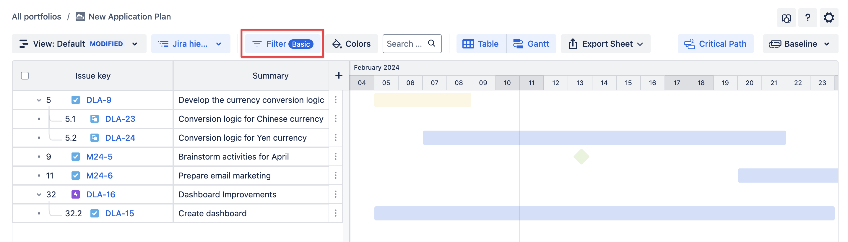 GanttTable supports Filter to refine and narrow down data fields and quickly locate relevant Jira issues.