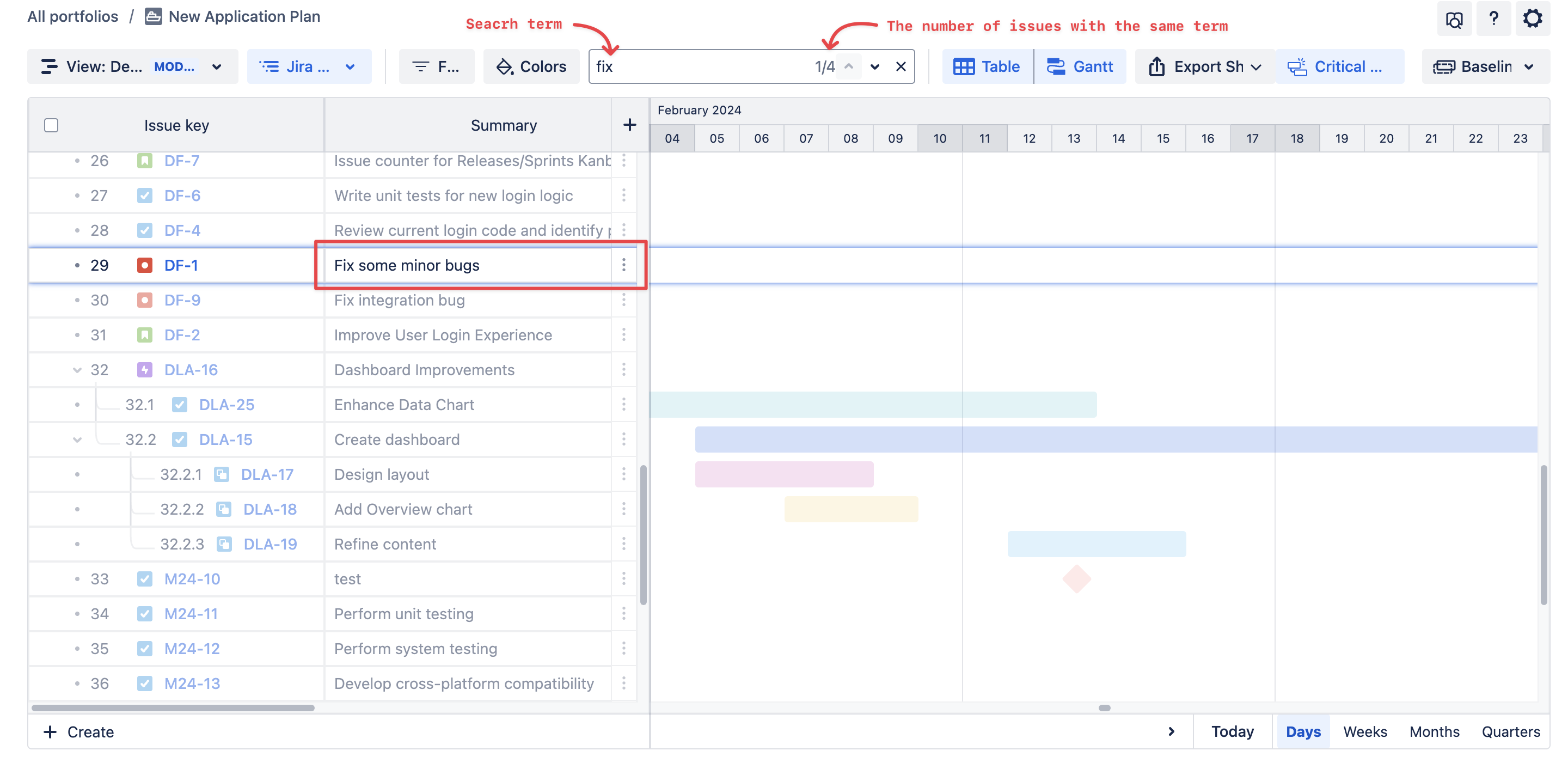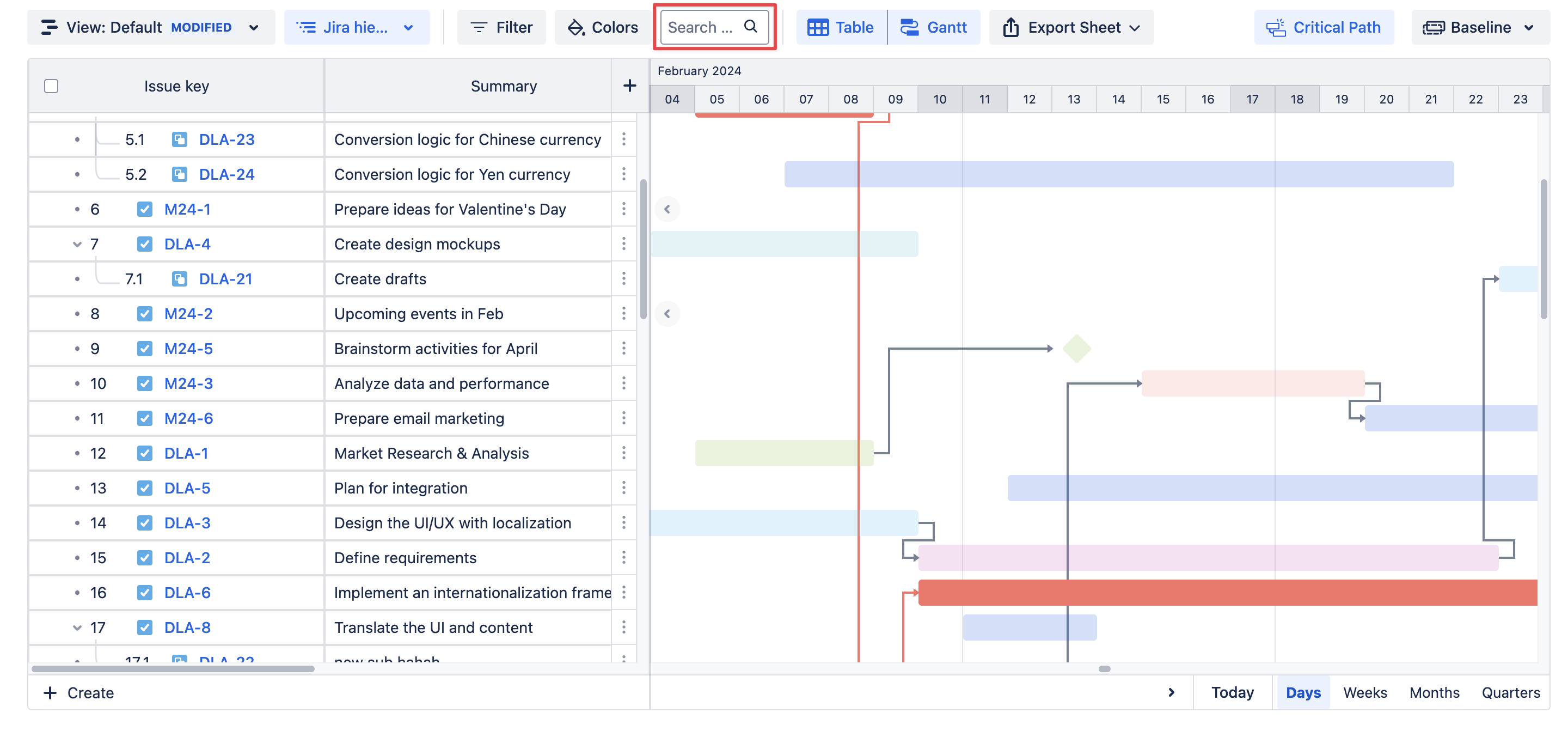 Quickly locate specific tasks or Jira issues by using the Search feature.