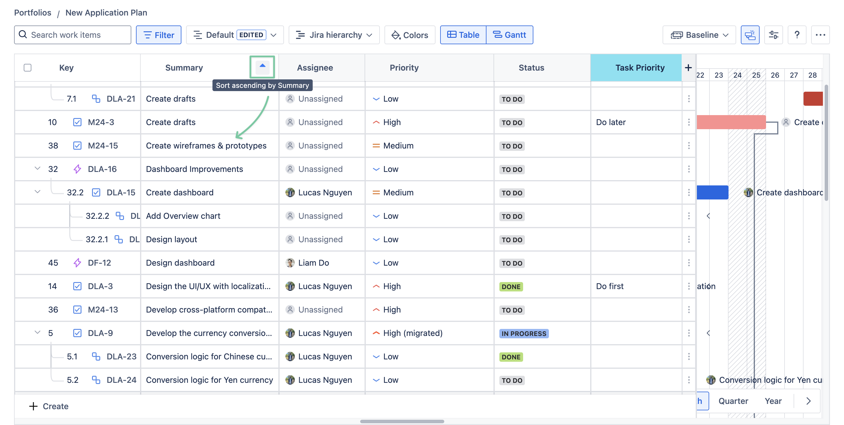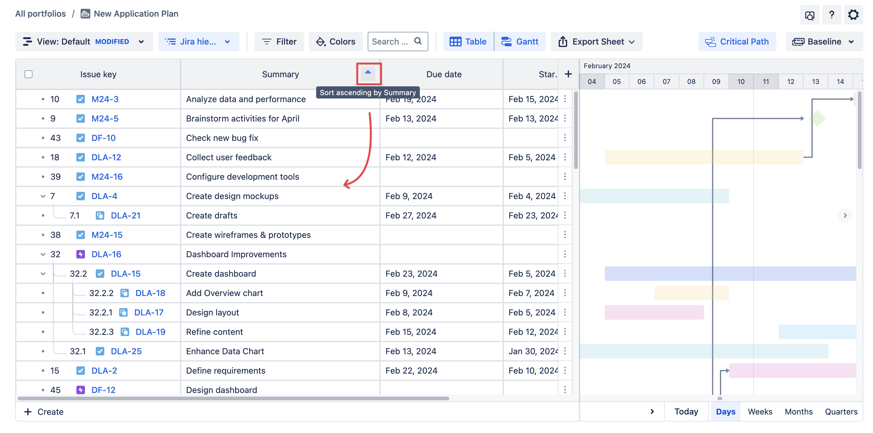 Use the Sort feature to arrange Jira issues in the table by a chosen column in ascending or descending order.