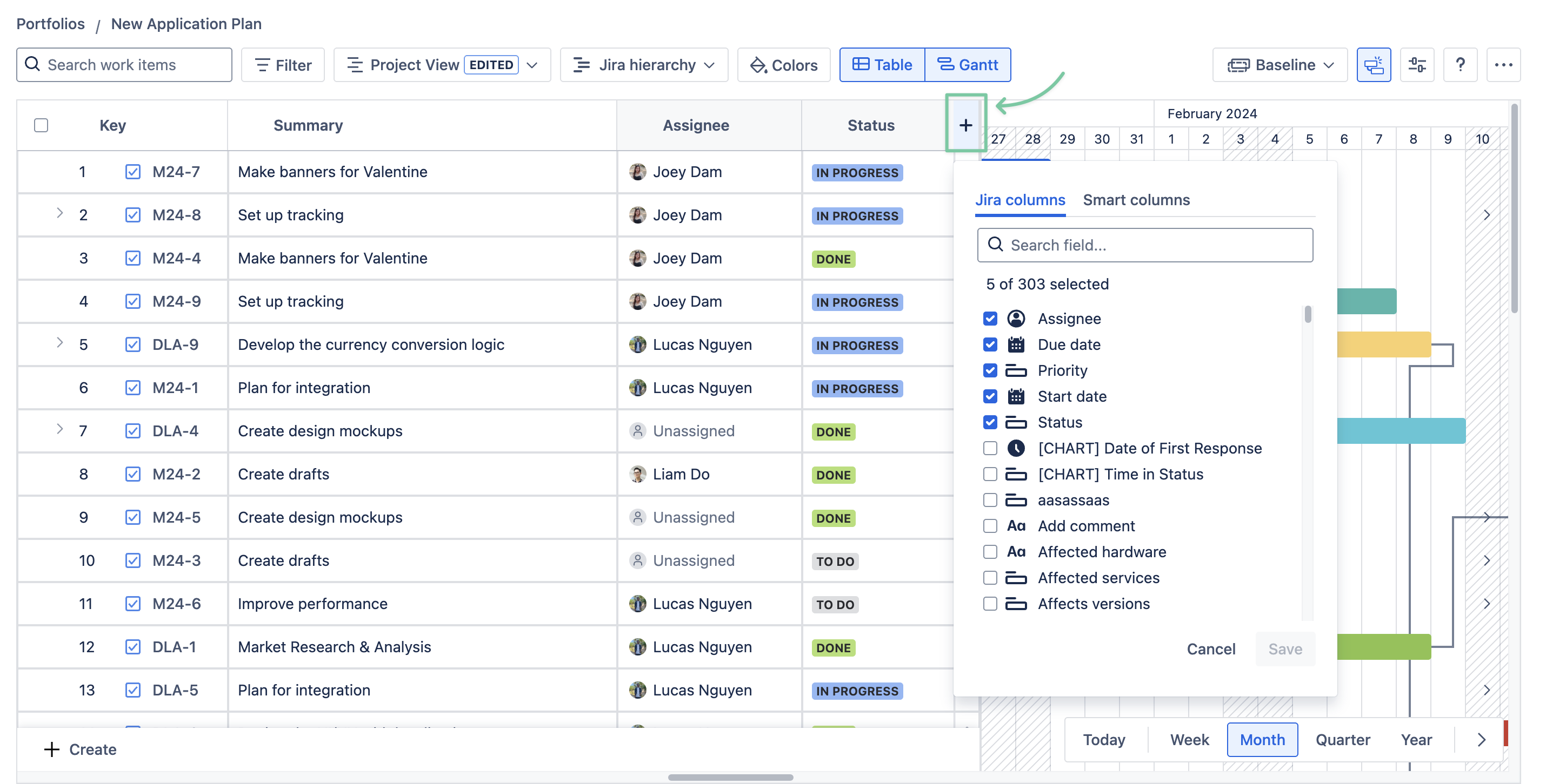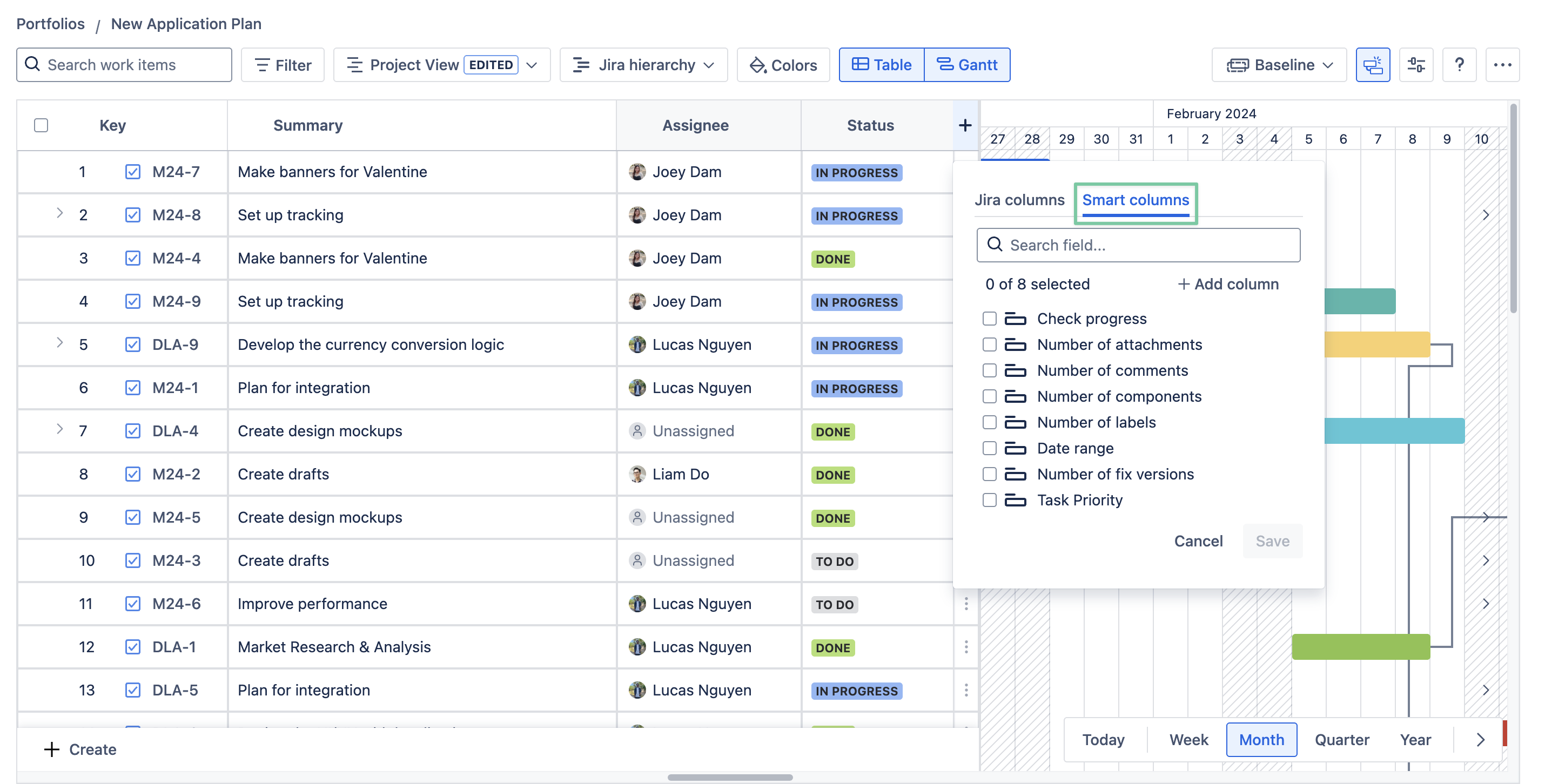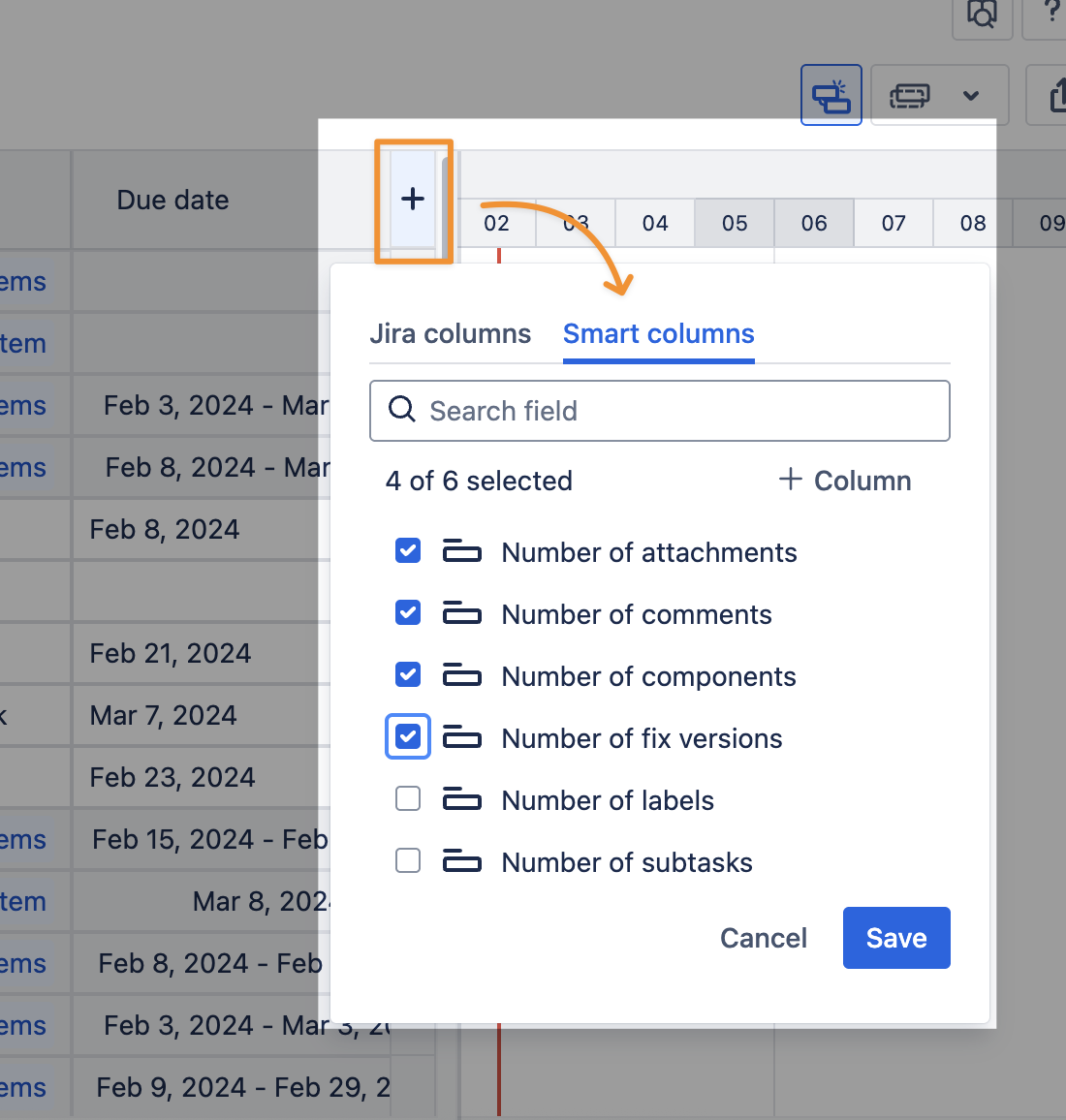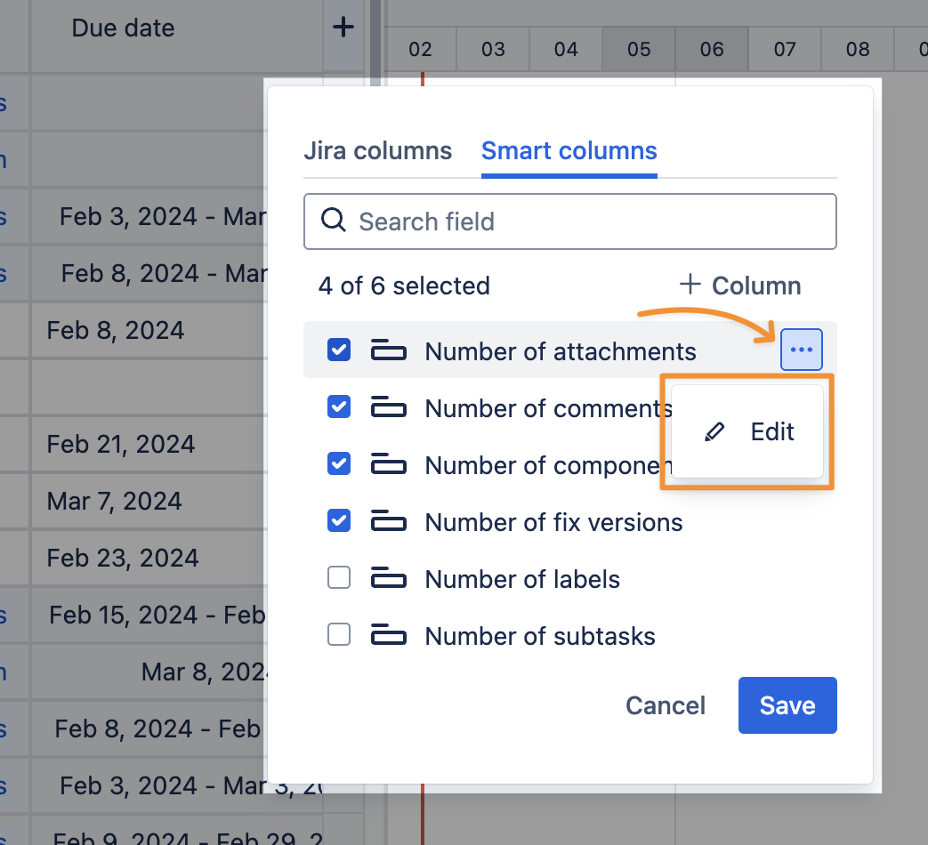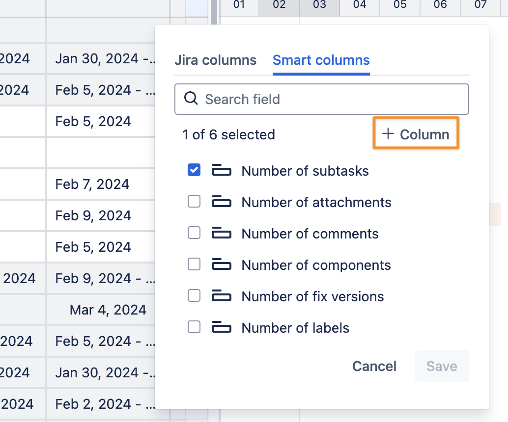 In GanttTable, you can use Smart columns to display calculated or derived information of two Jira work item fields in the details. You can choose 5 prebuilt Smart columns or create and customize a new column to suit your needs.