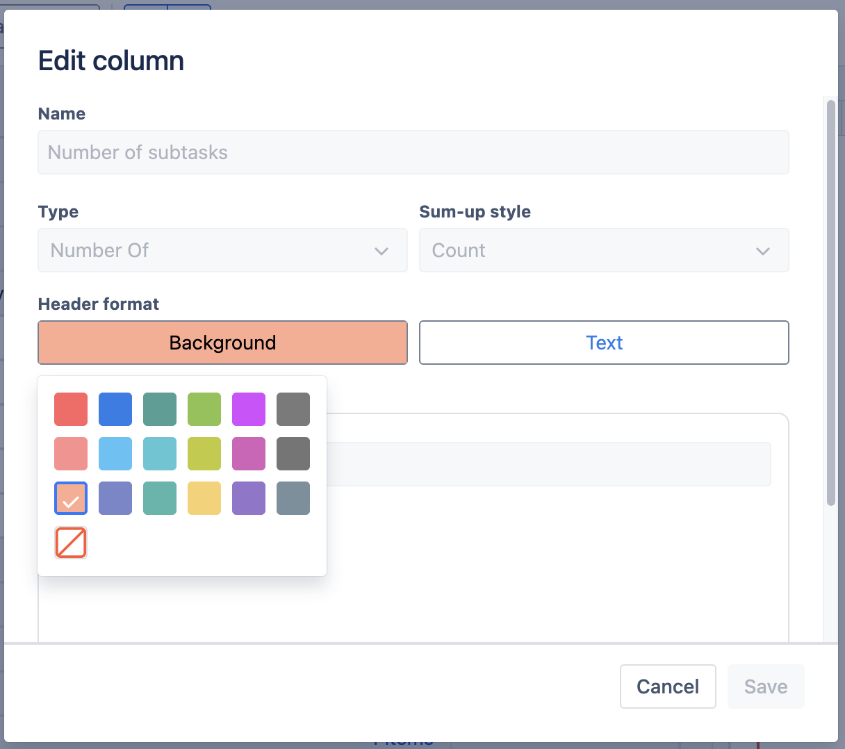 In the Edit column dialog, you’ll see 2 options to change the colors of the cell background and text in the Header format section.
