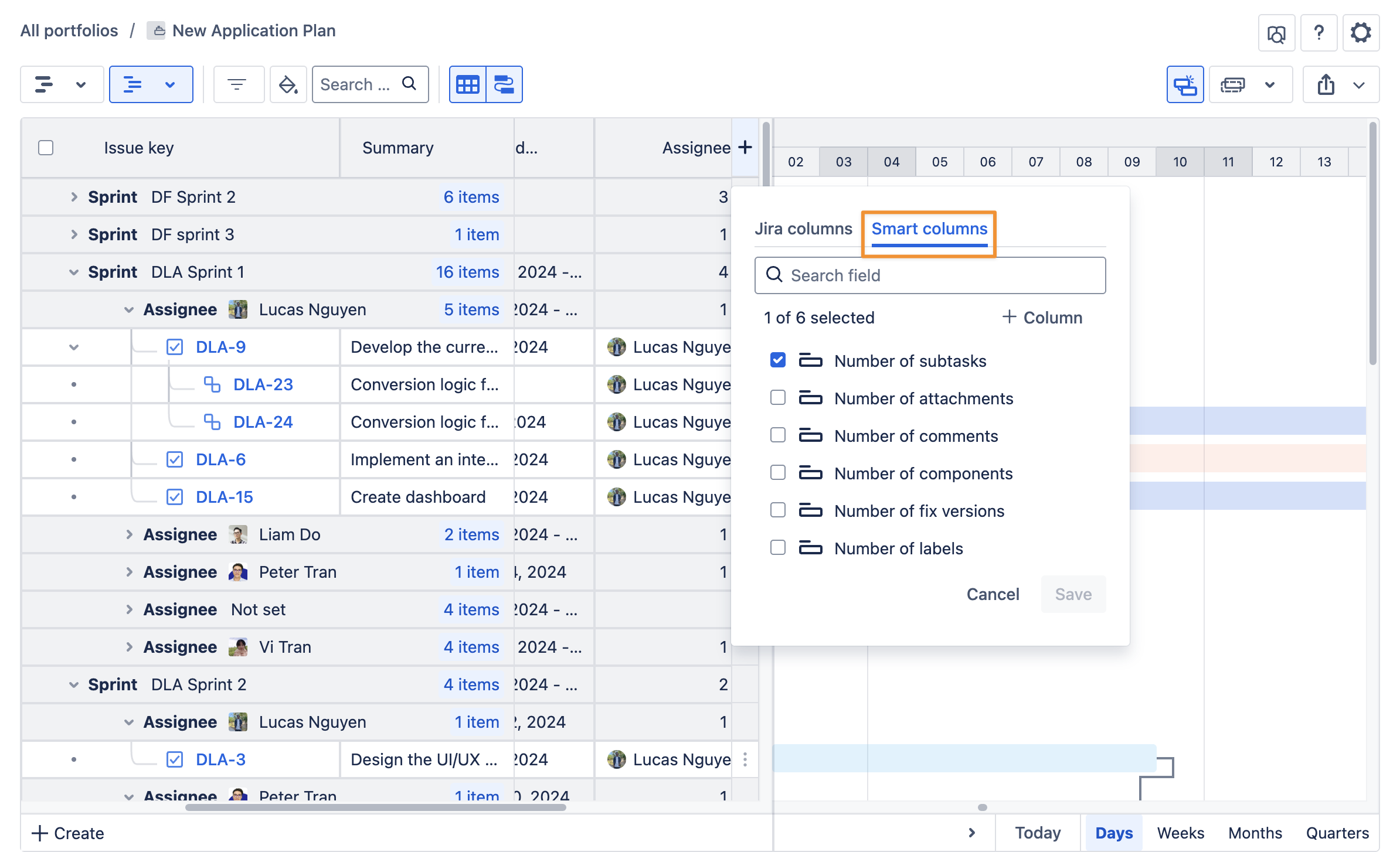 In GanttTable, you can use Smart columns to display calculated or derived information of two Jira issue fields in the issue details. You can choose 6 prebuilt Smart columns or create and customize a new column to suit your needs.