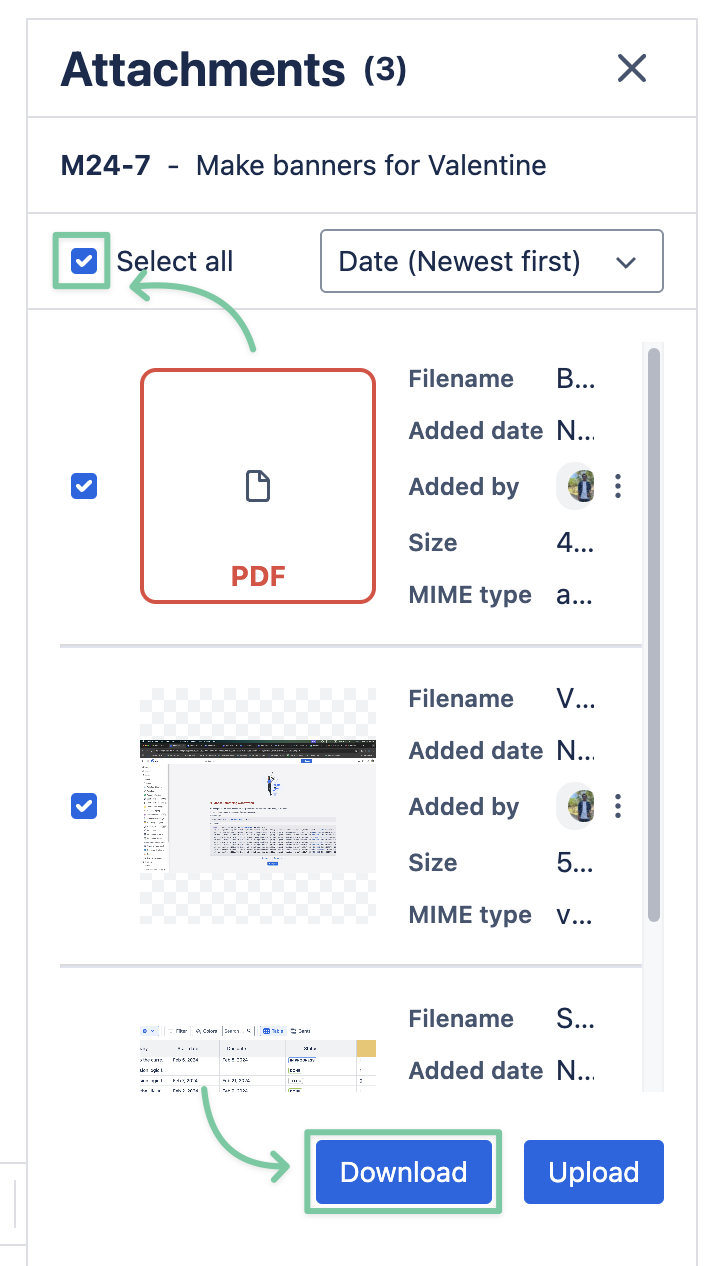 To download all files in bulk, choose Select all the files in the Attachments section and click Download.