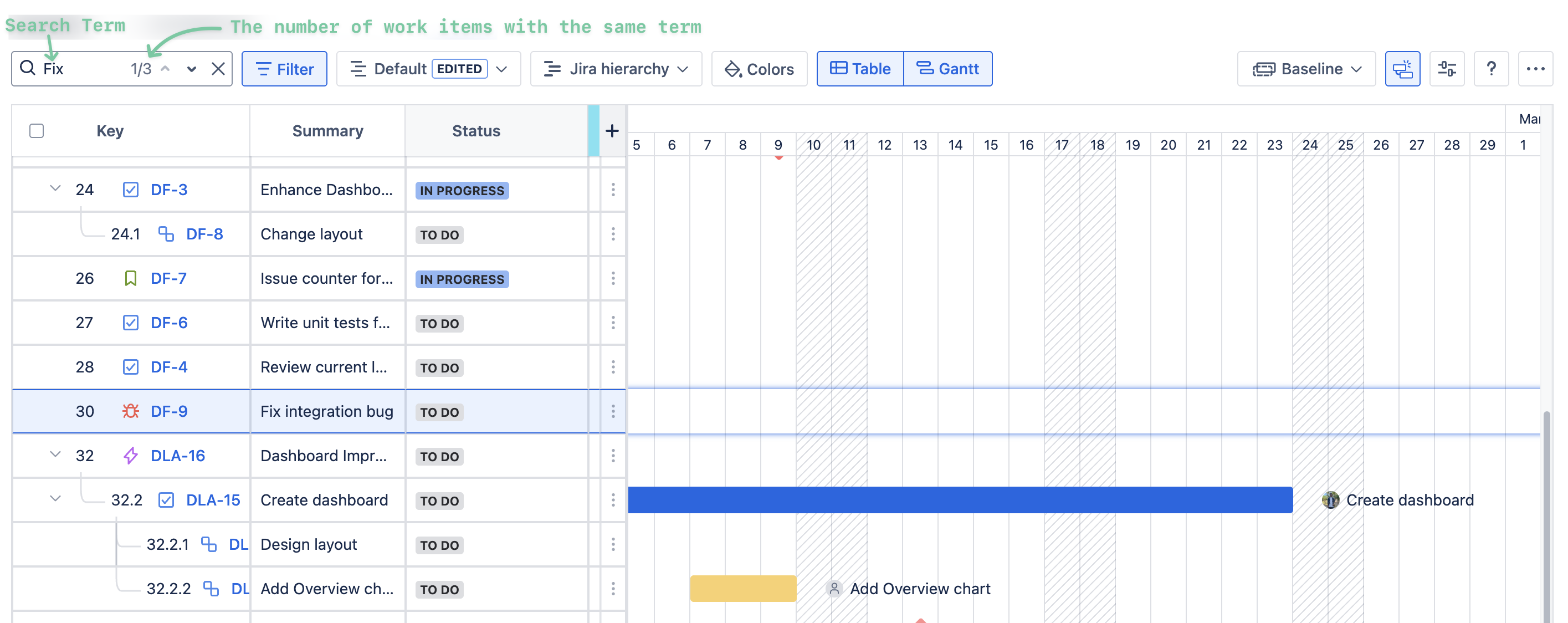 Quickly locate specific tasks or Jira work items by using the Search feature.
