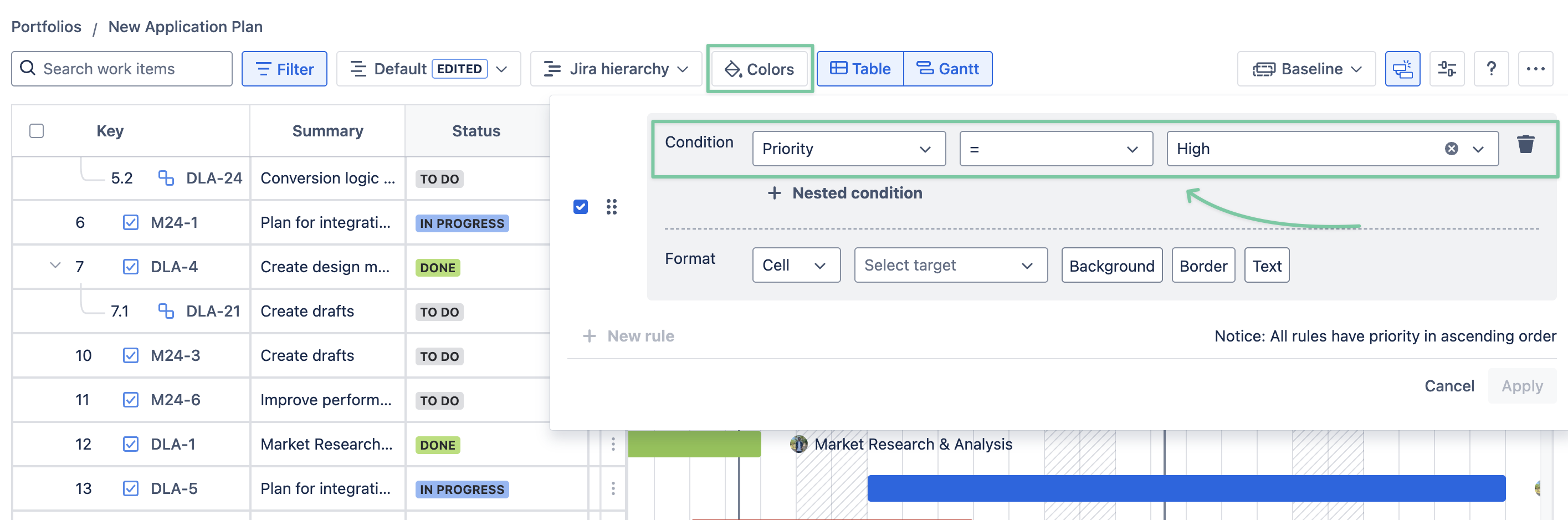 In the dialog, you can choose which field will be used for the condition and the value related to that field. (For example, in the image below, we’re selecting Priority and choosing the ‘High’ priority as the condition)
