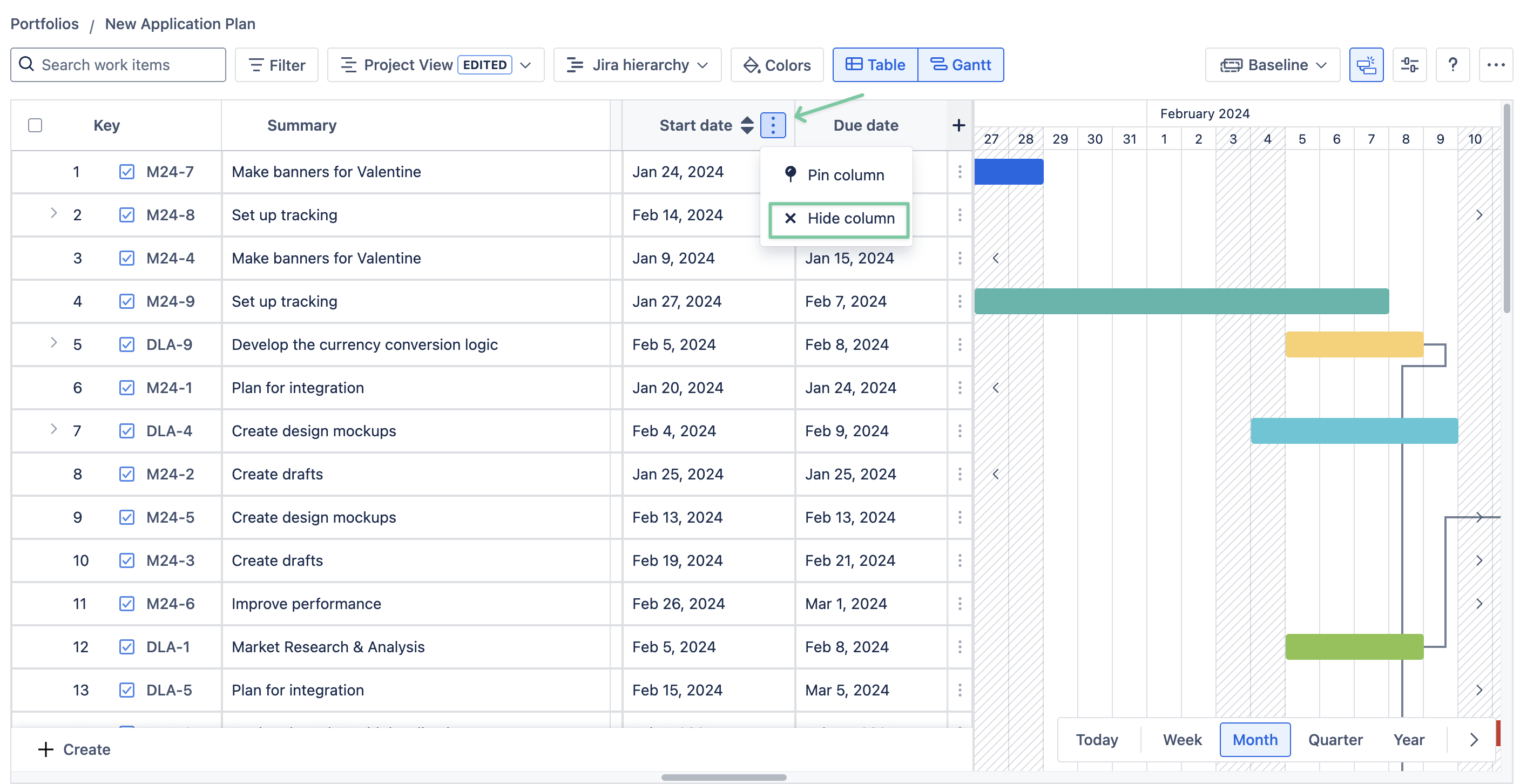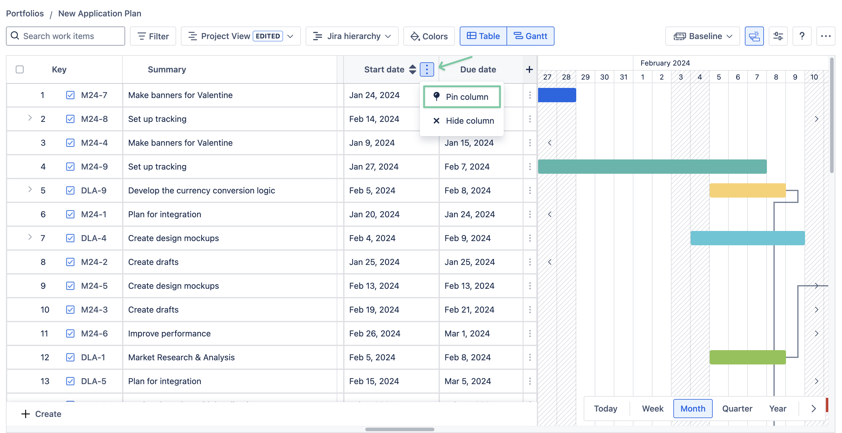 By default, the app freezes the Issue key and Summary columns on the left. You can freeze other columns as well by using the pin function.