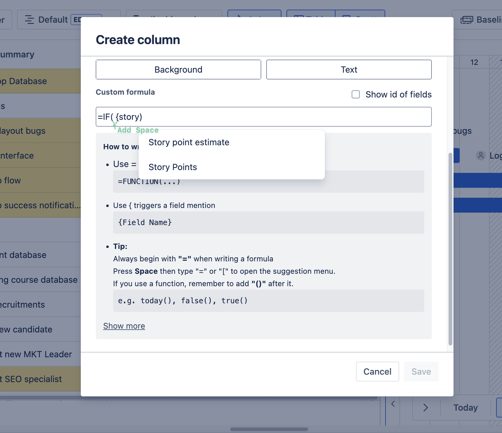 3. To trigger a field mention, you need to add a Space [ ␣ ] first, then type { to select the Jira field.