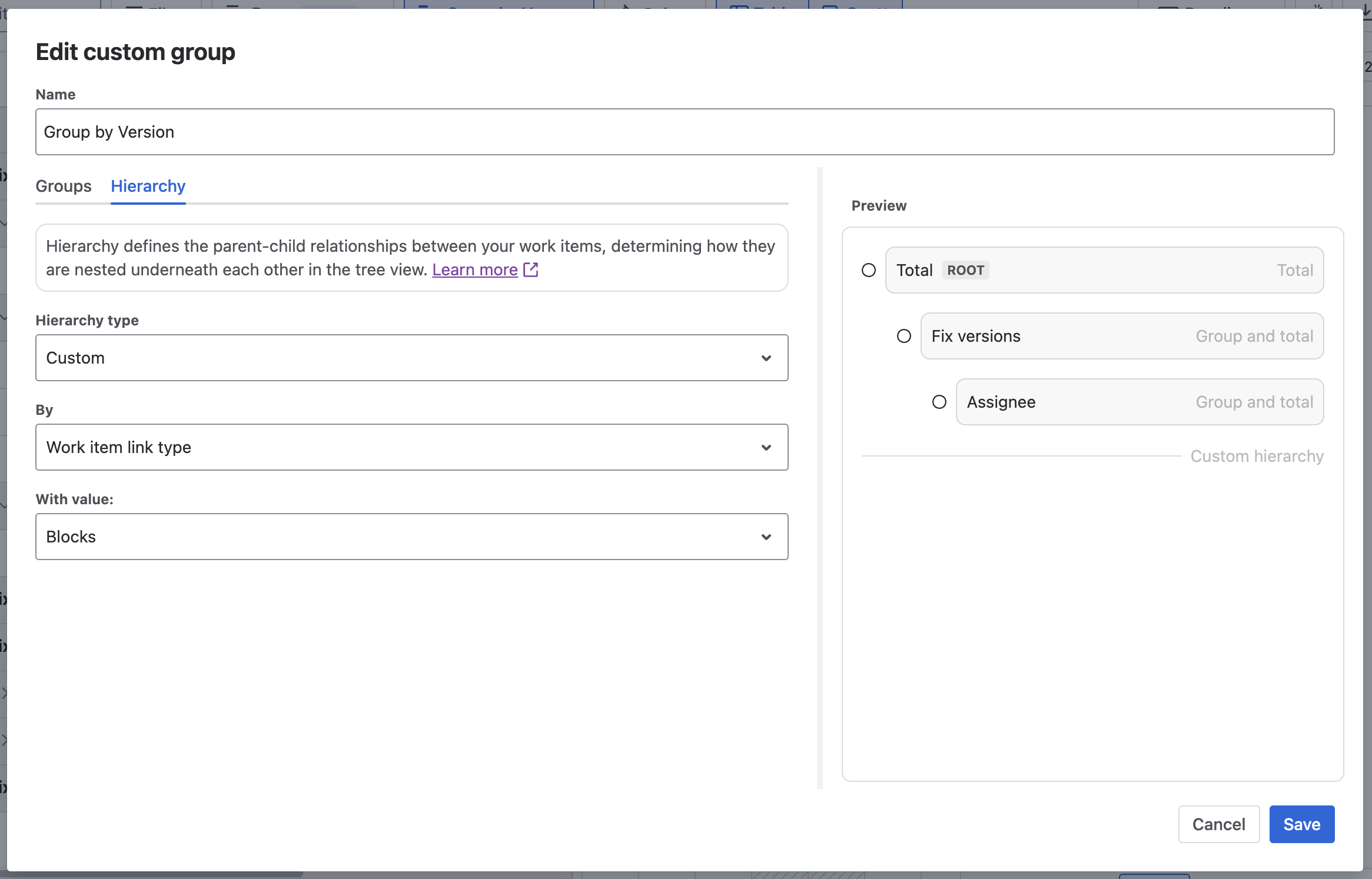 4. Group levels | You can add different Jira fields to your custom group, allowing you to categorize or organize issues by a specific field or criterion for better analysis or visualization. |