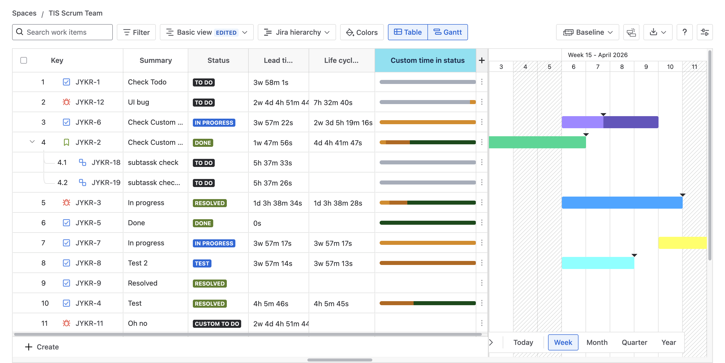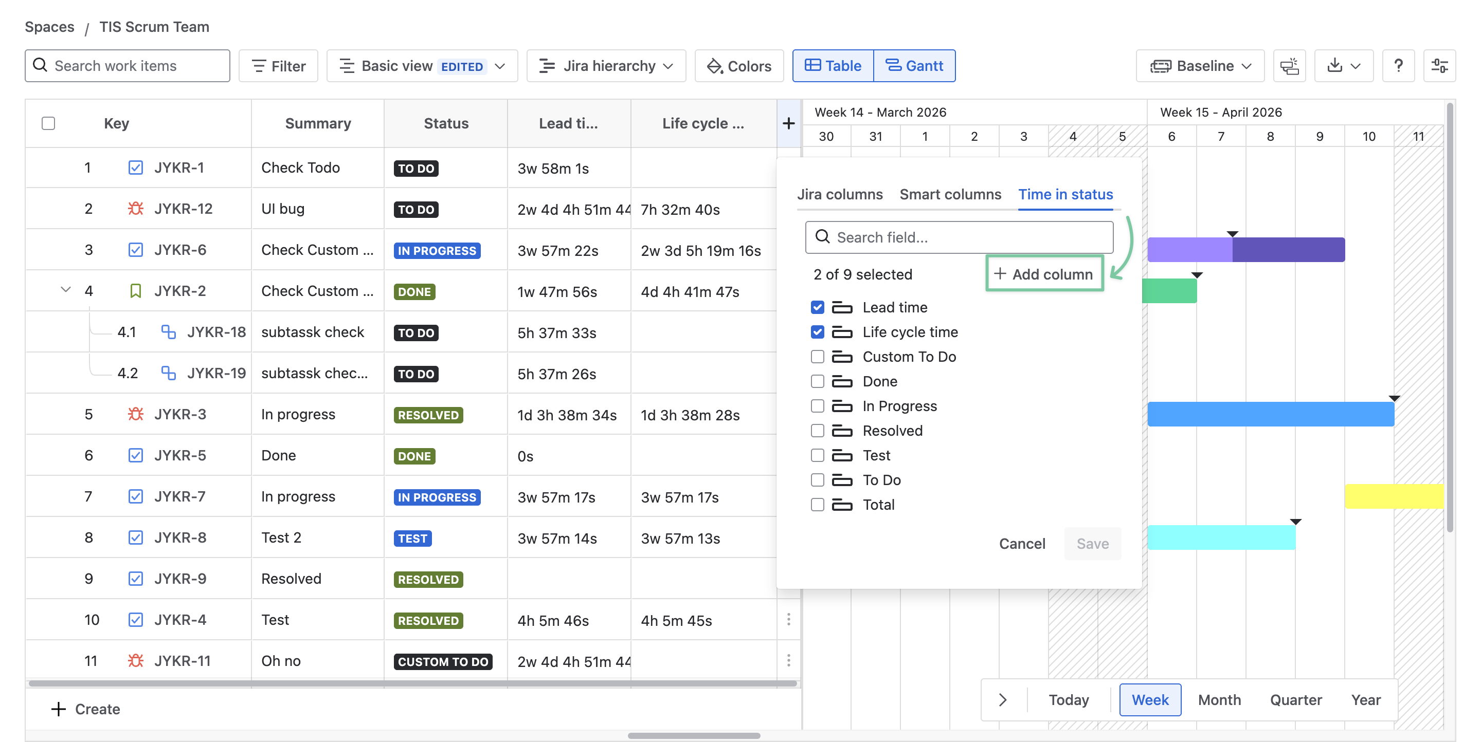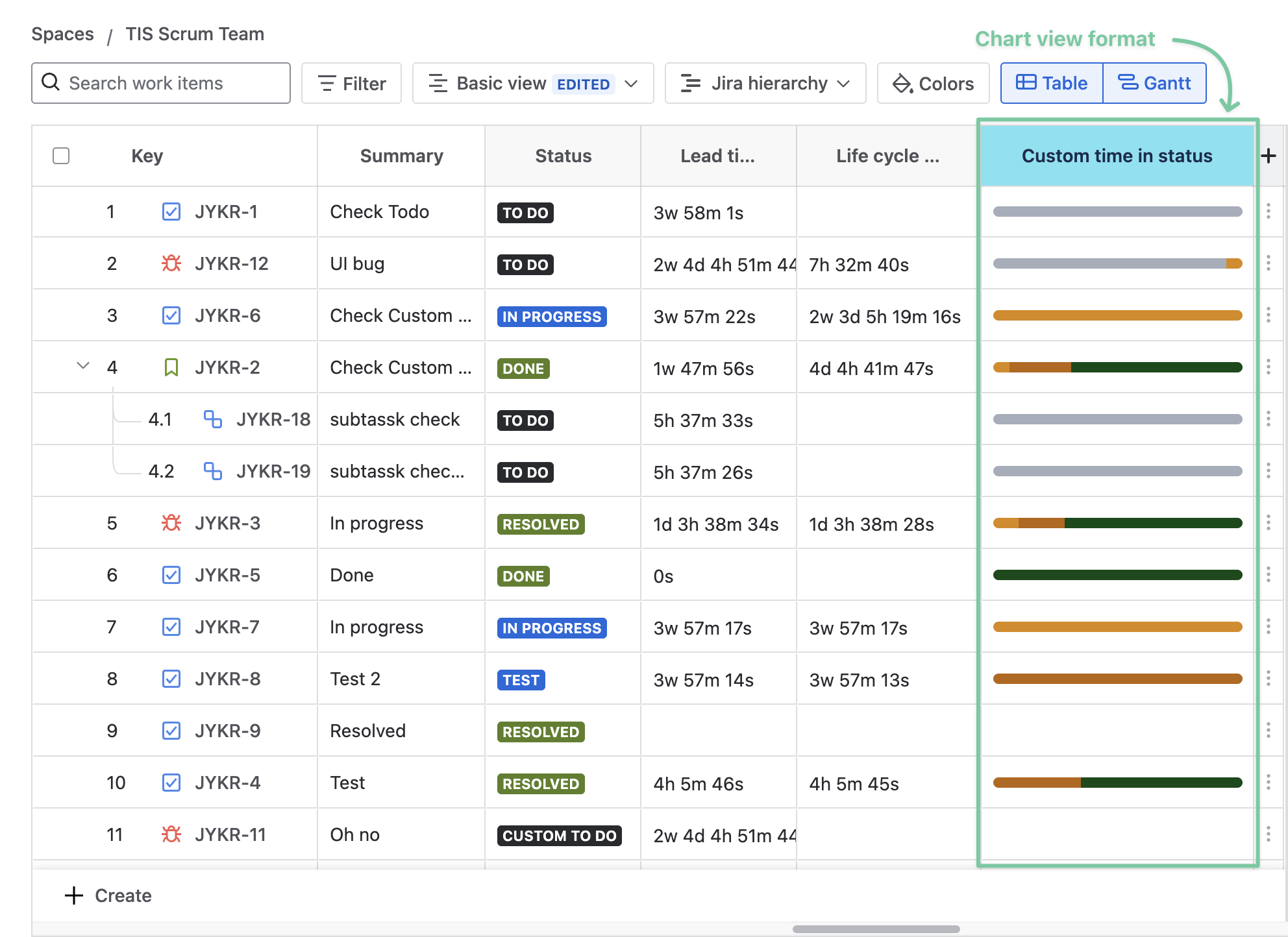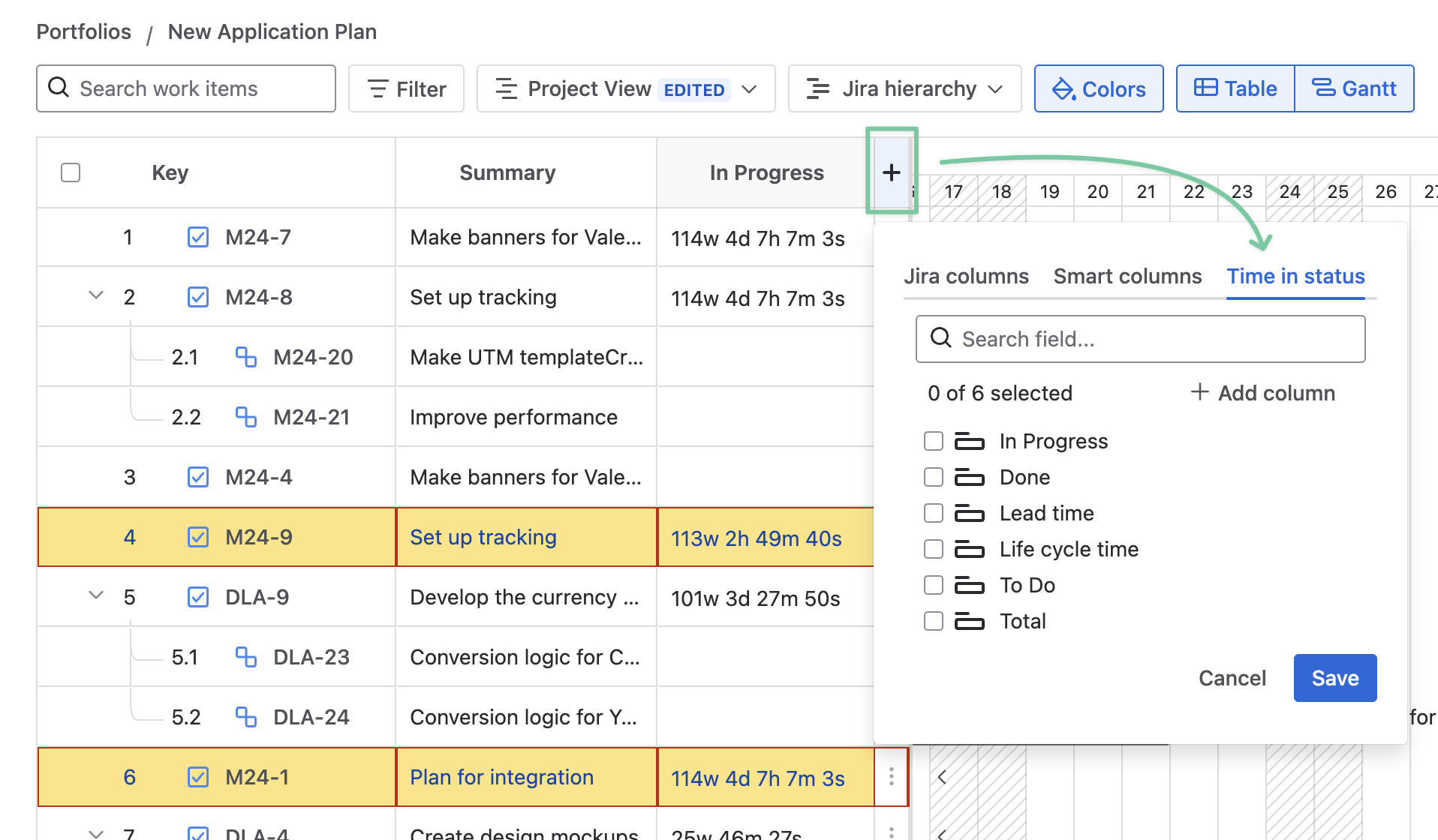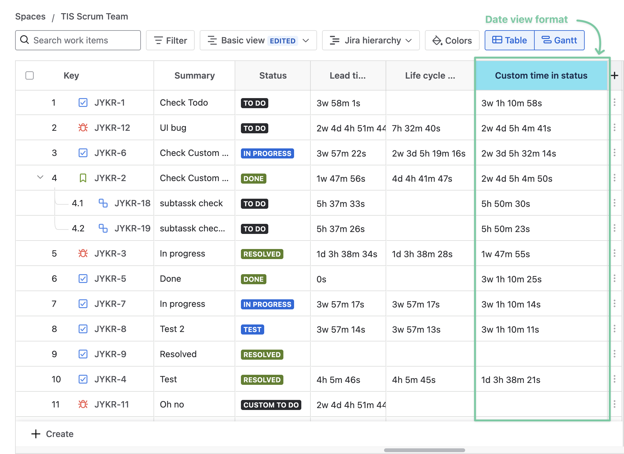 Users can add a custom Time in status column to GanttTable to calculate the total time for a work item across all included statuses.
