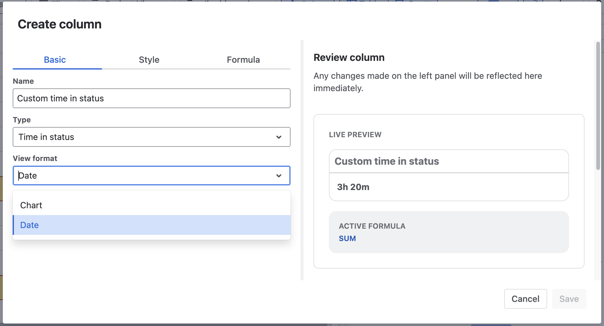 In the dialog, users can name this custom Time in status column and choose the View format.