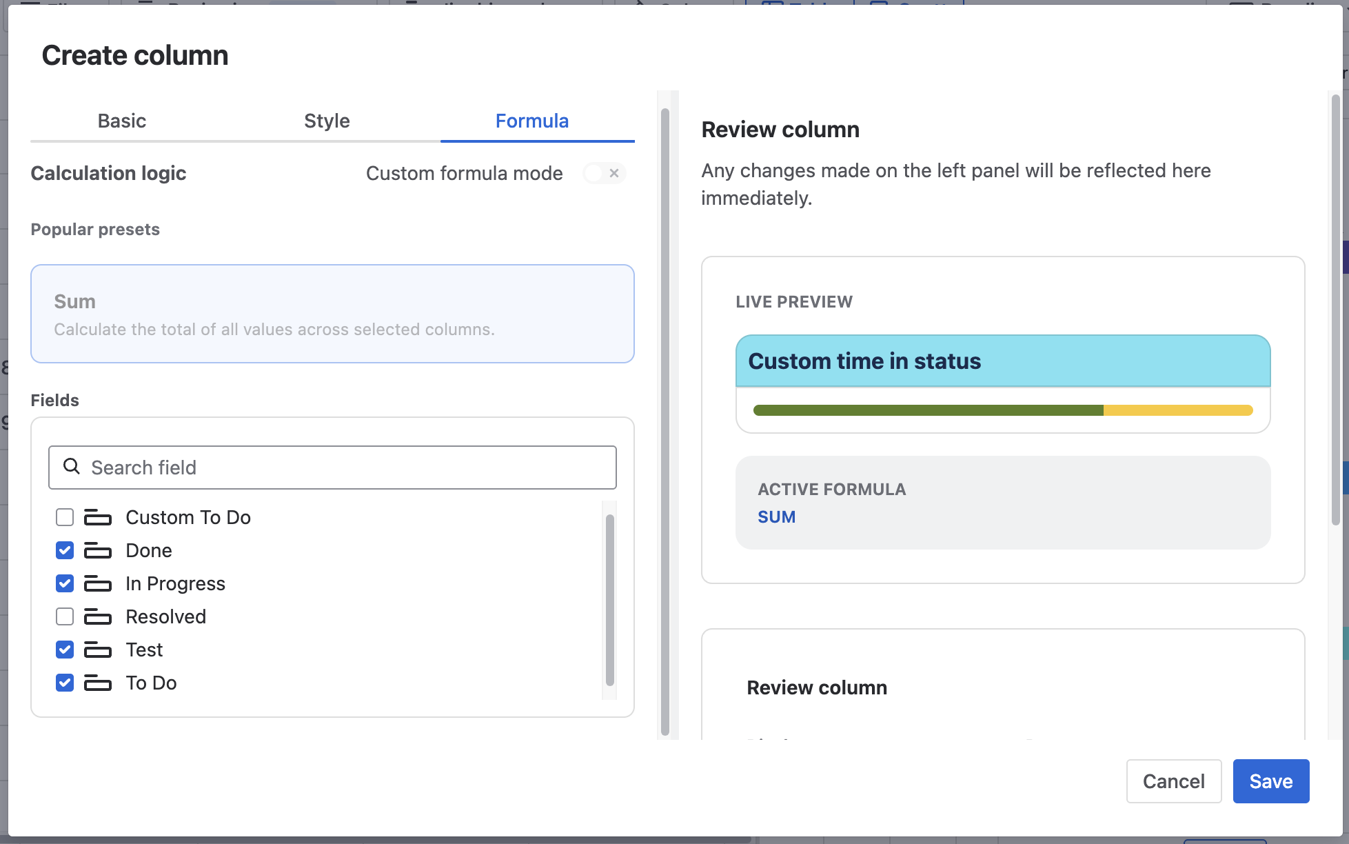 In Formula, users can select which field statuses to use in this column.