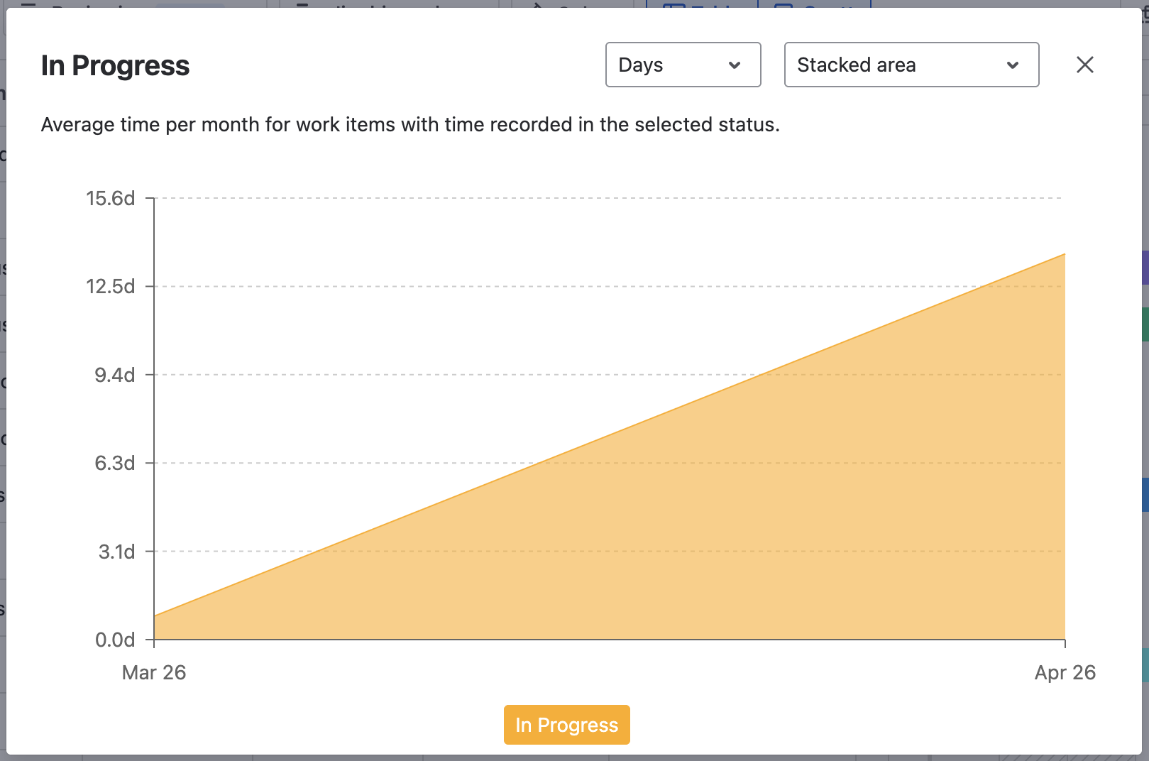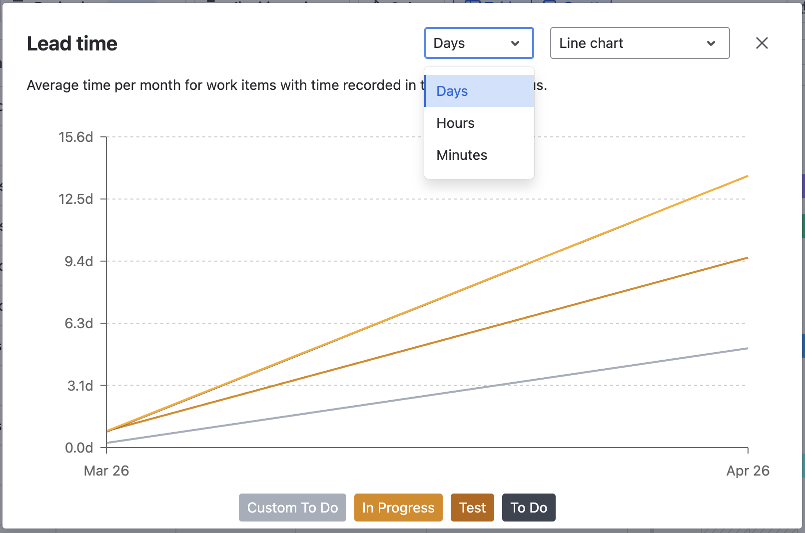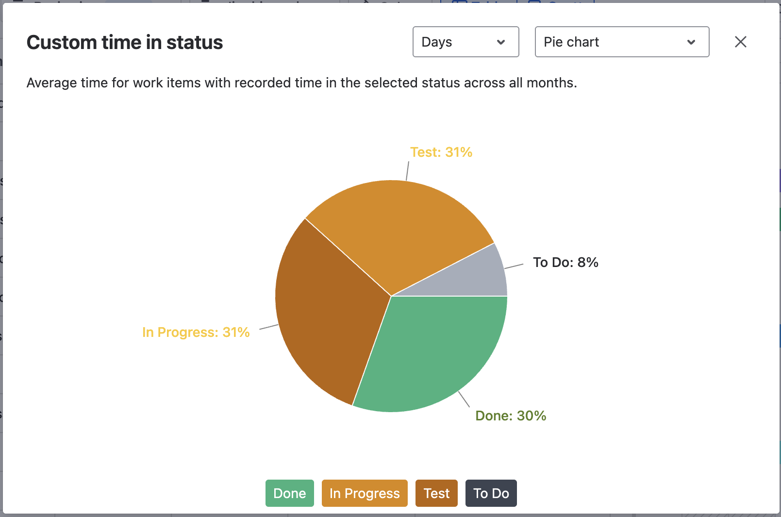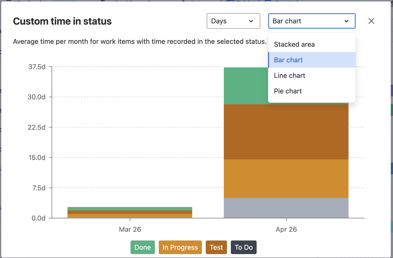 When used in Lead time, Life cycle time, Total, or custom time in status, chart views can provide a bigger picture, comparing how time is spent on different statuses on average.