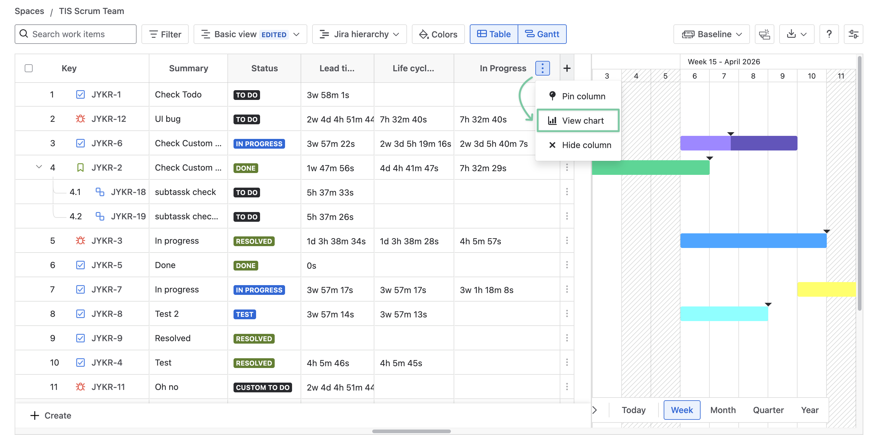To open the view chart, locate the three-dot symbol on the time in status column. Click it and choose View chart.