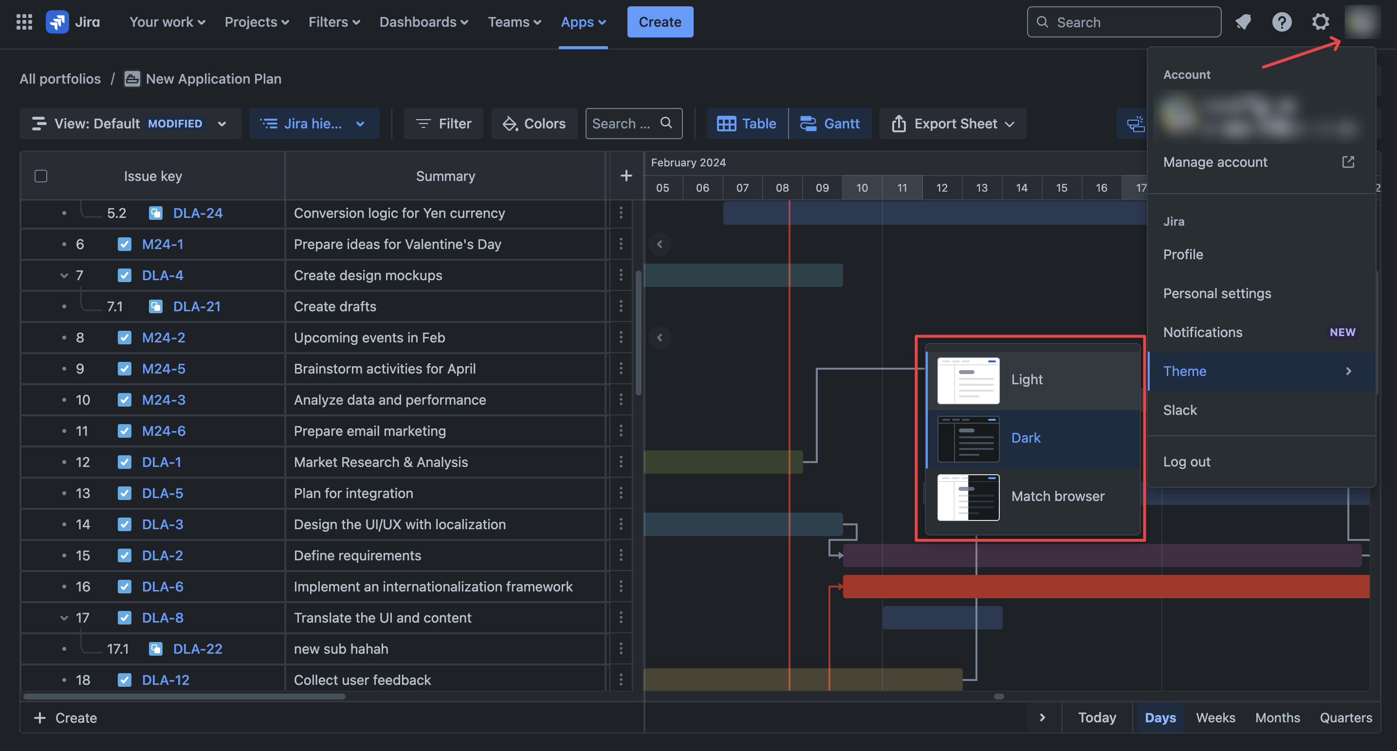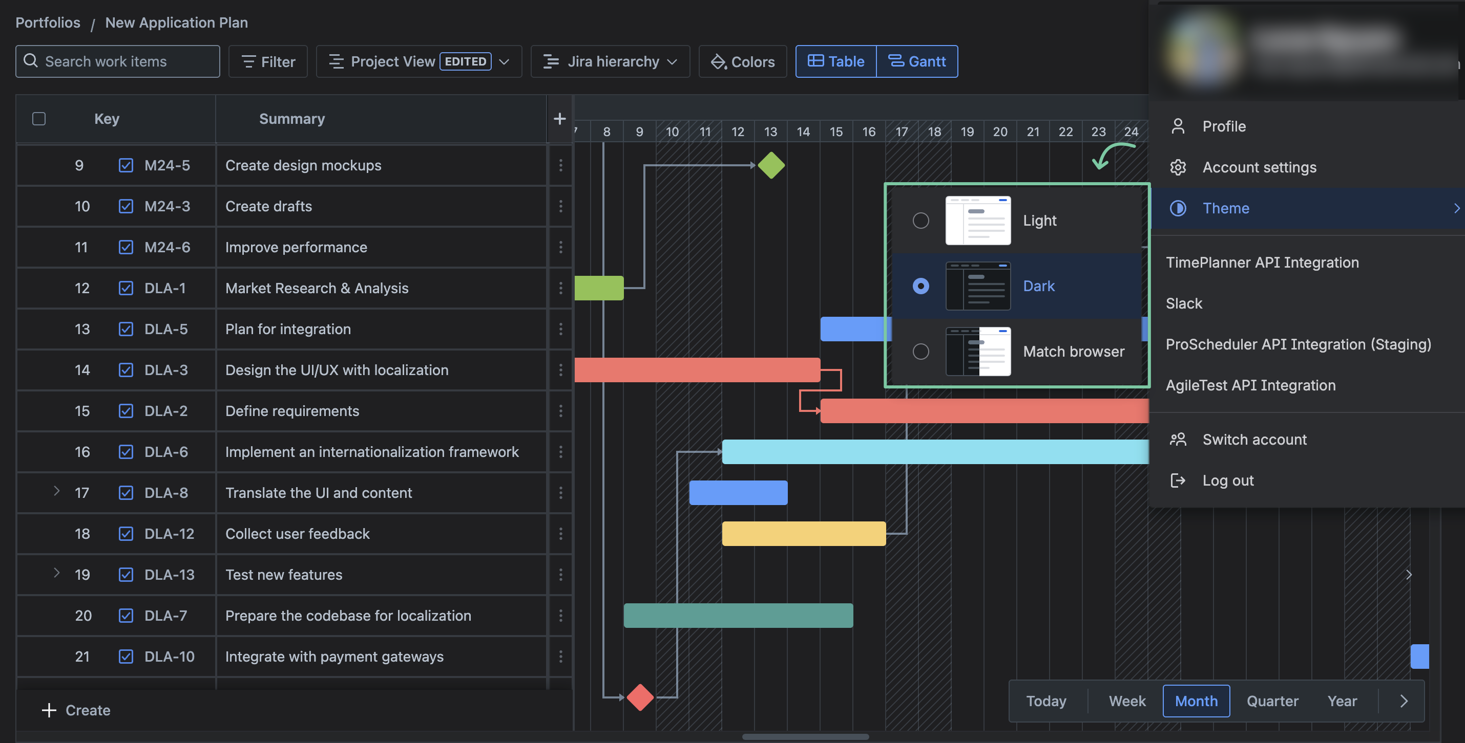 GanttTable also supports the Dark mode theme based on the theme settings from Jira. Users can switch between:
