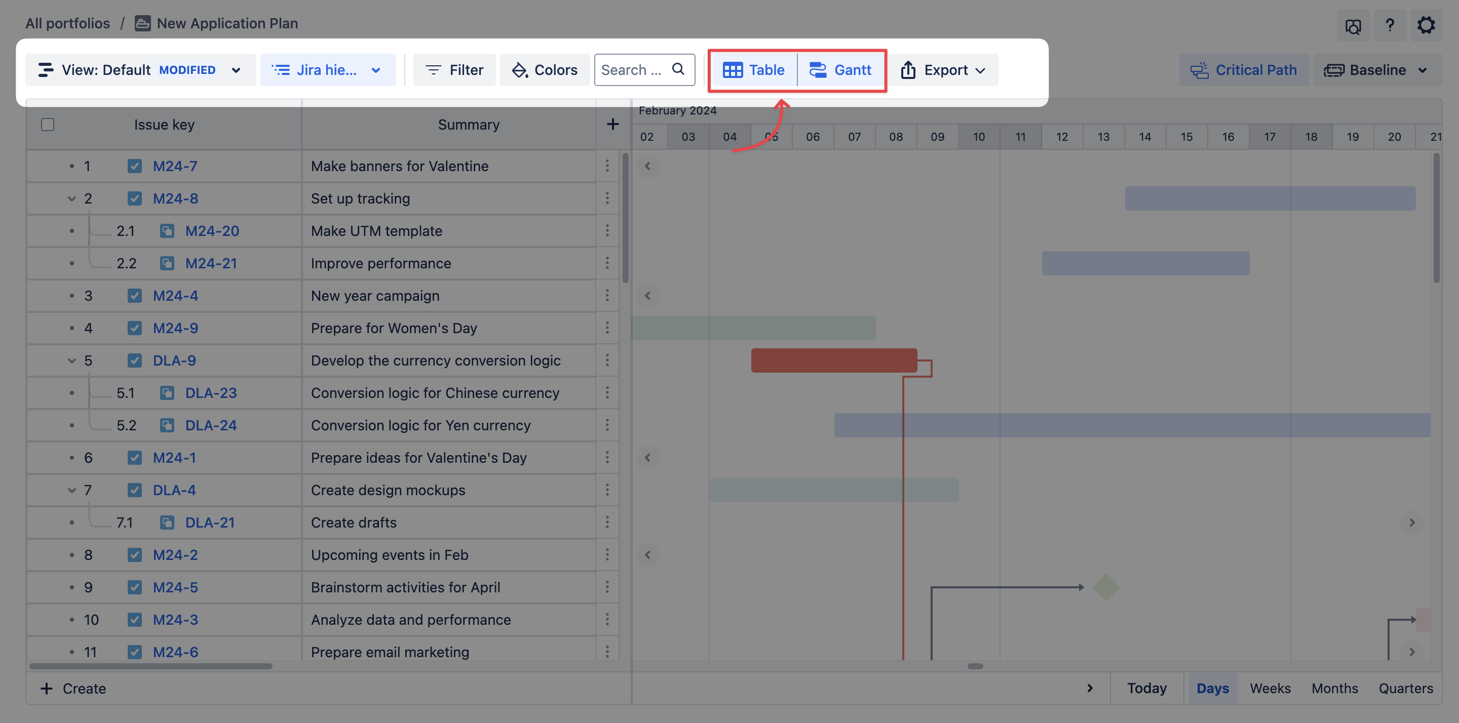 In GanttTable, there are 2 main views you will be working with: the Table view and the Gantt view. Each view provides a different way of managing and visualizing your Jira projects and issues.
