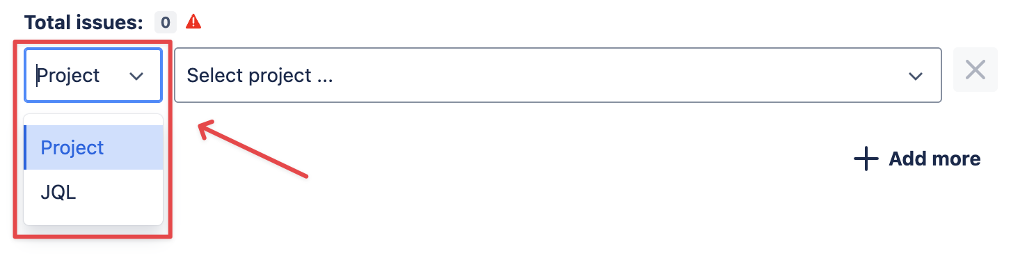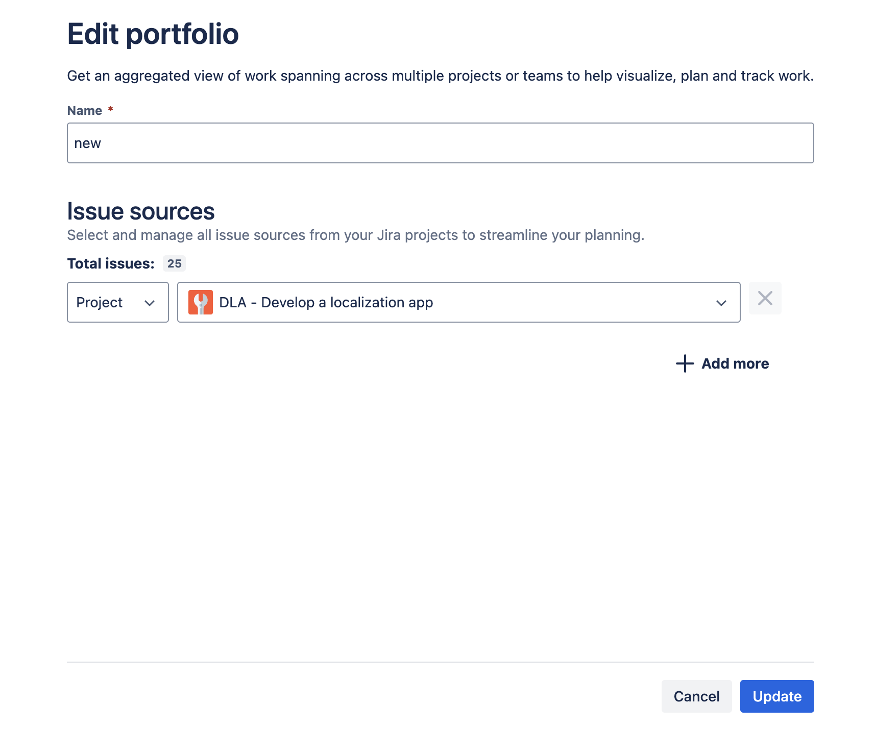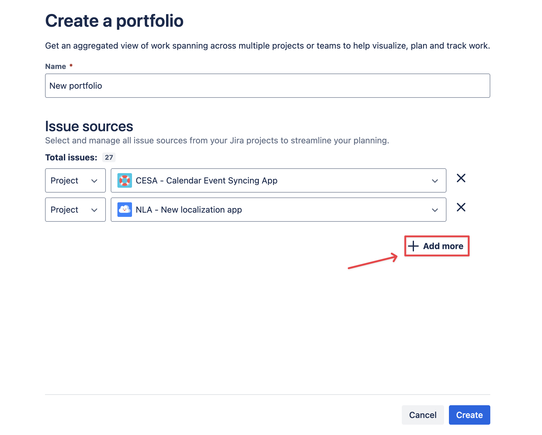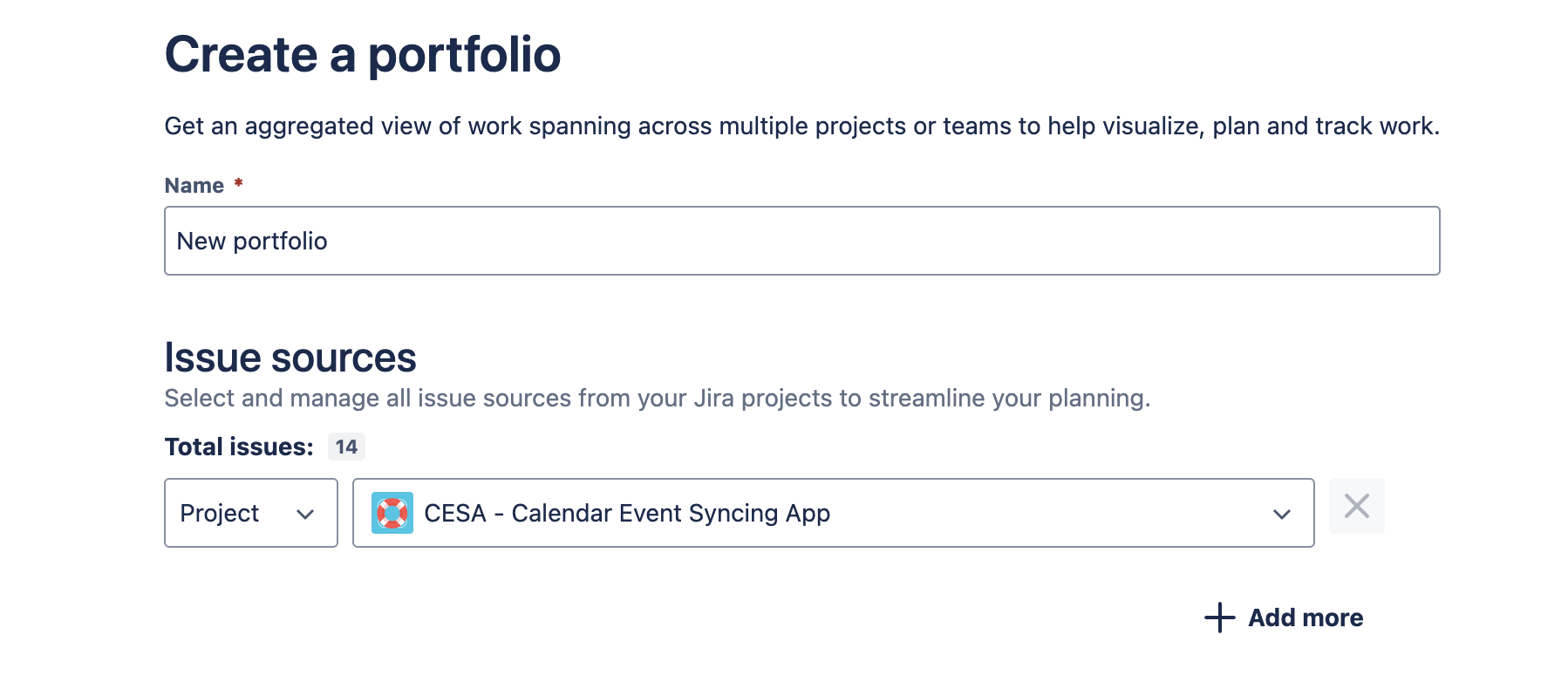 To use more than one Jira project as your issue sources, click +Add more to add more projects to this portfolio.