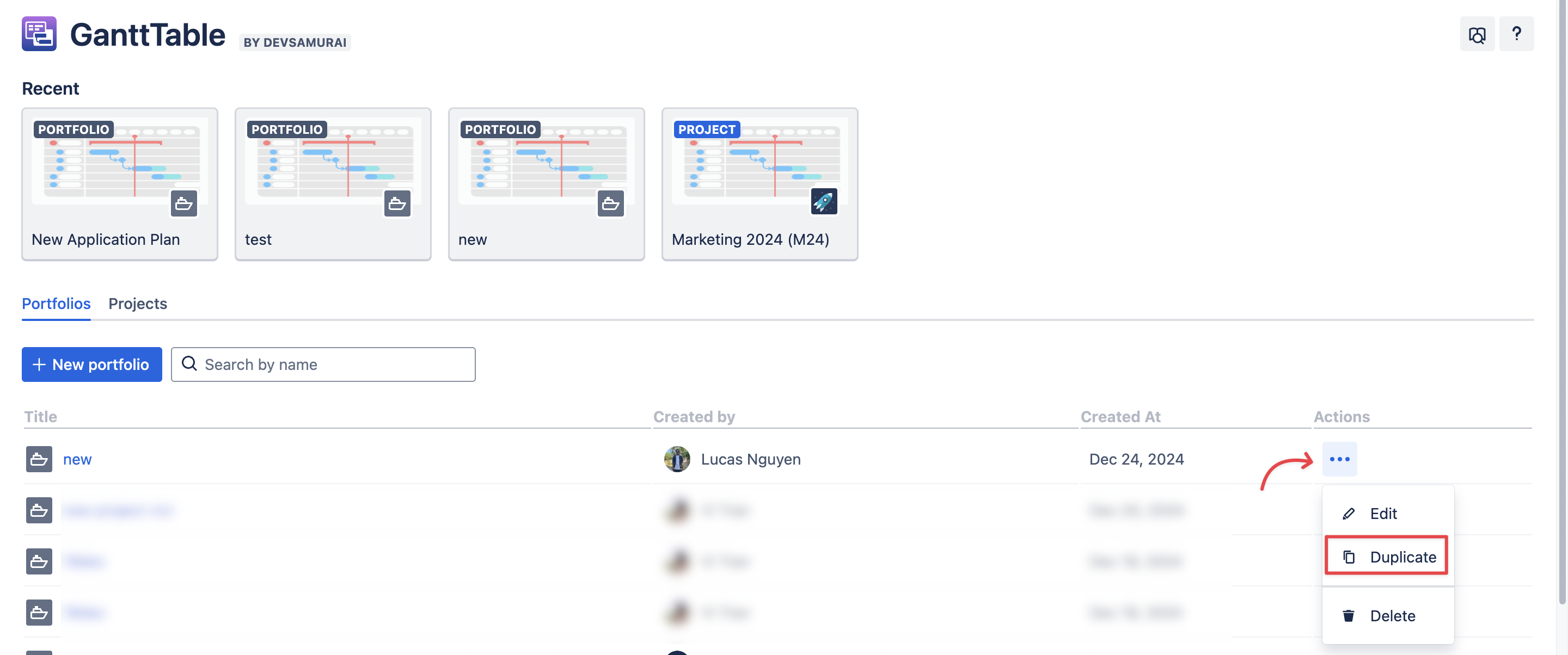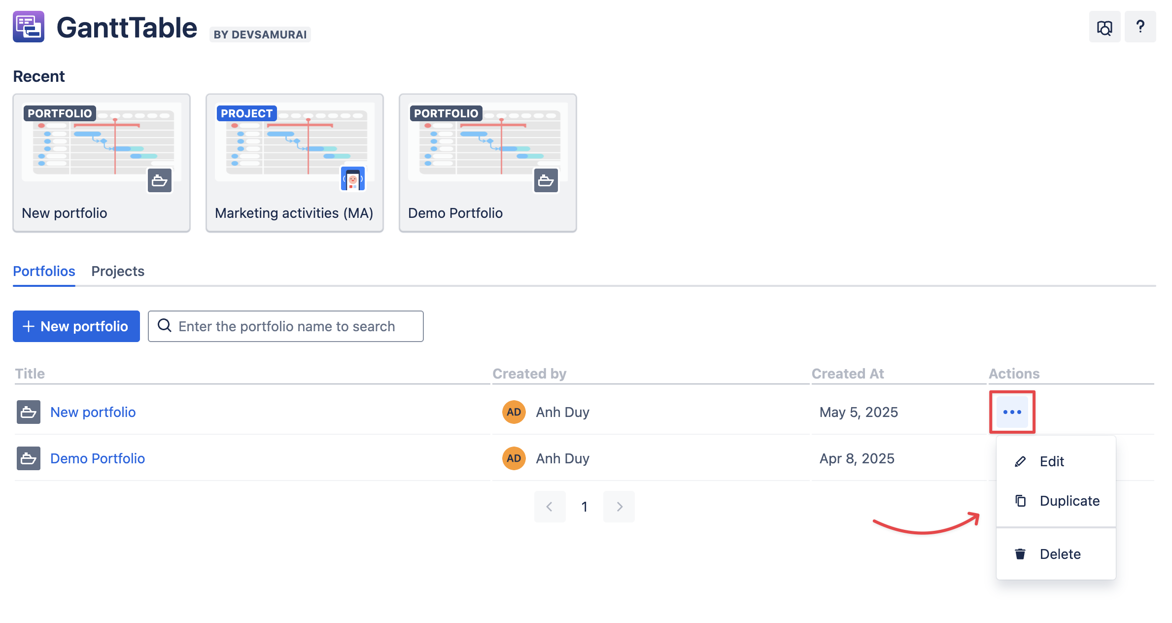 You can quickly create a new portfolio by duplicating an existing one. Again, find ••• to open the actions menu at right-side of the portfolio row that you want to copy, and choose Duplicate.