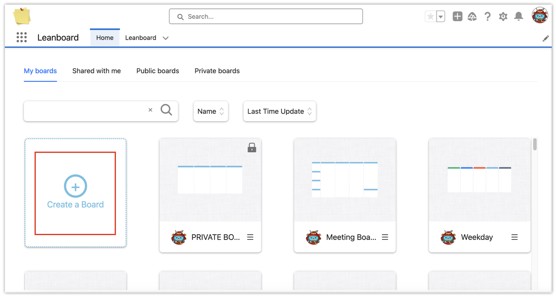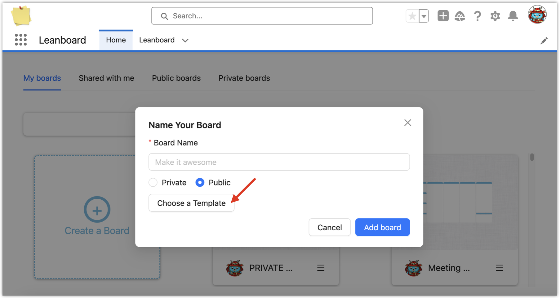 To create a new board, go to Apps → Leanboard, click on Create a board button