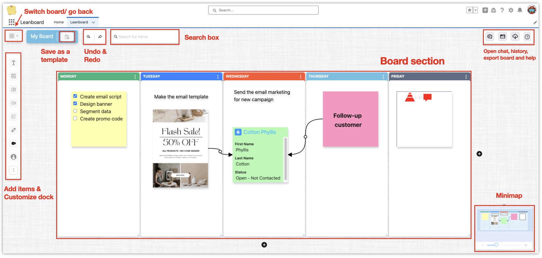 When your idea or plan gets bigger, so do your board and sections. It can be hard to have an overview of all things happening on board, and that is when the minimap feature will come in handy. It can give you brief looks at your board and stuff in it. Your board can be zoomed in and out too.