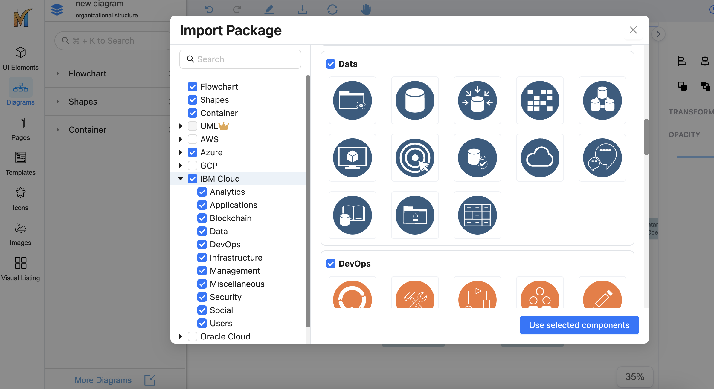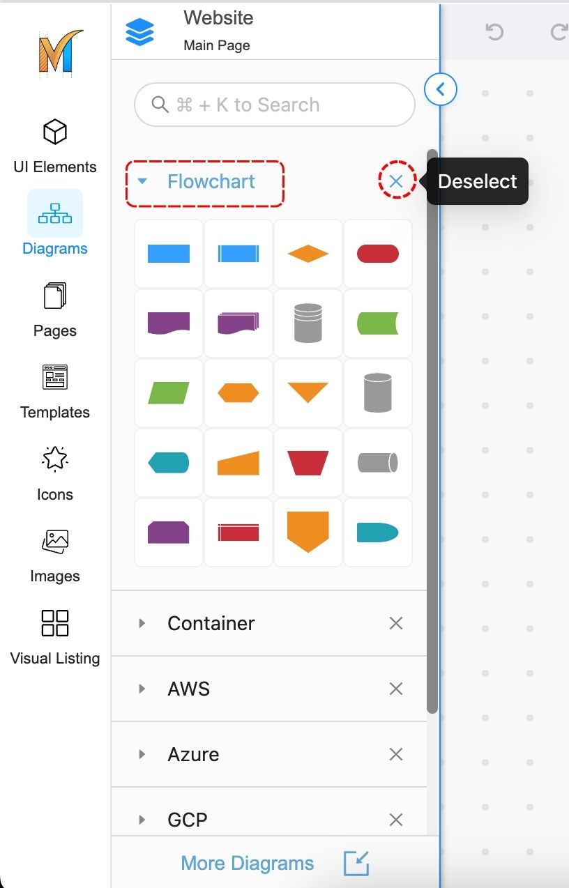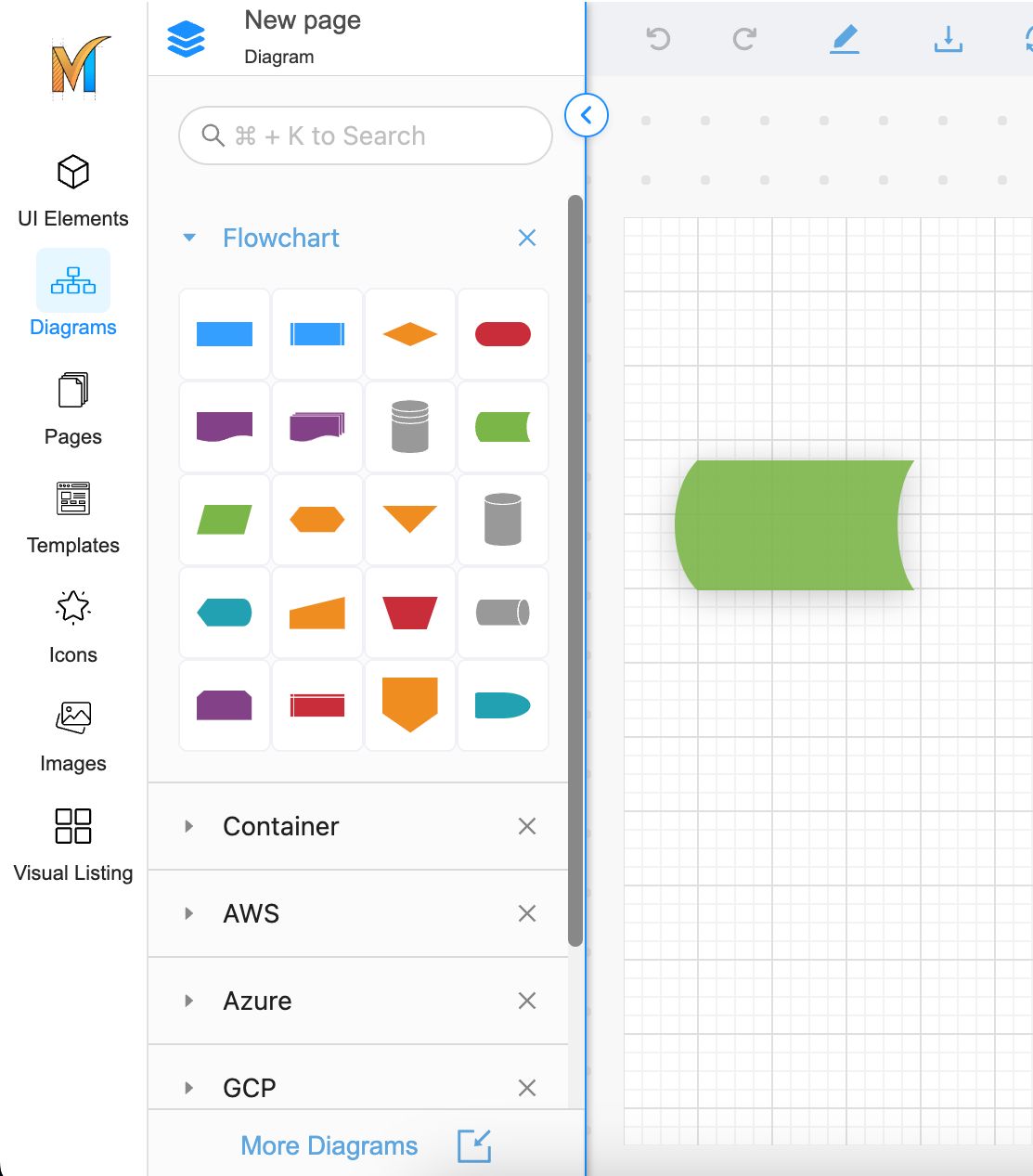 Mocky Diagrams library includes a wide range of designed diagrams, from simple shapes, flowcharts, networks to containers.