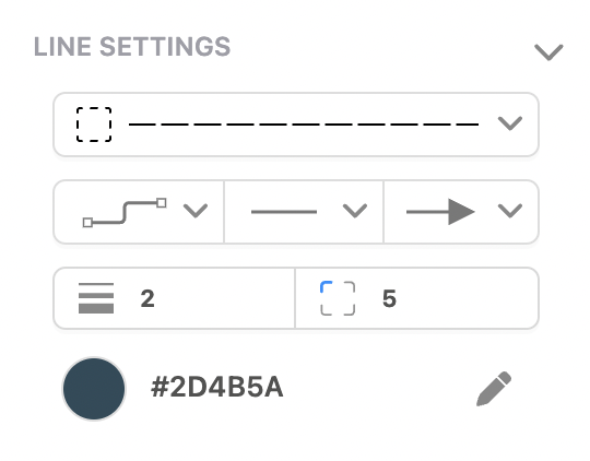 To customize and style a diagram connector, click on the line, and access the Line Settings in the Settings Panel. Here, you can set the stroke type, line shape, arrow tail, arrowhead, and line color according to your preferences