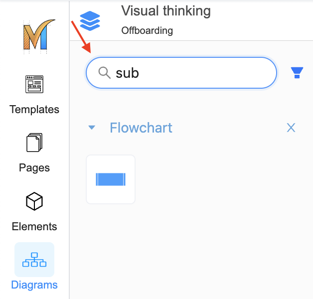 To search diagrams, use the search box at the top of the Diagram panel. Search will show the results of all the filtered categories