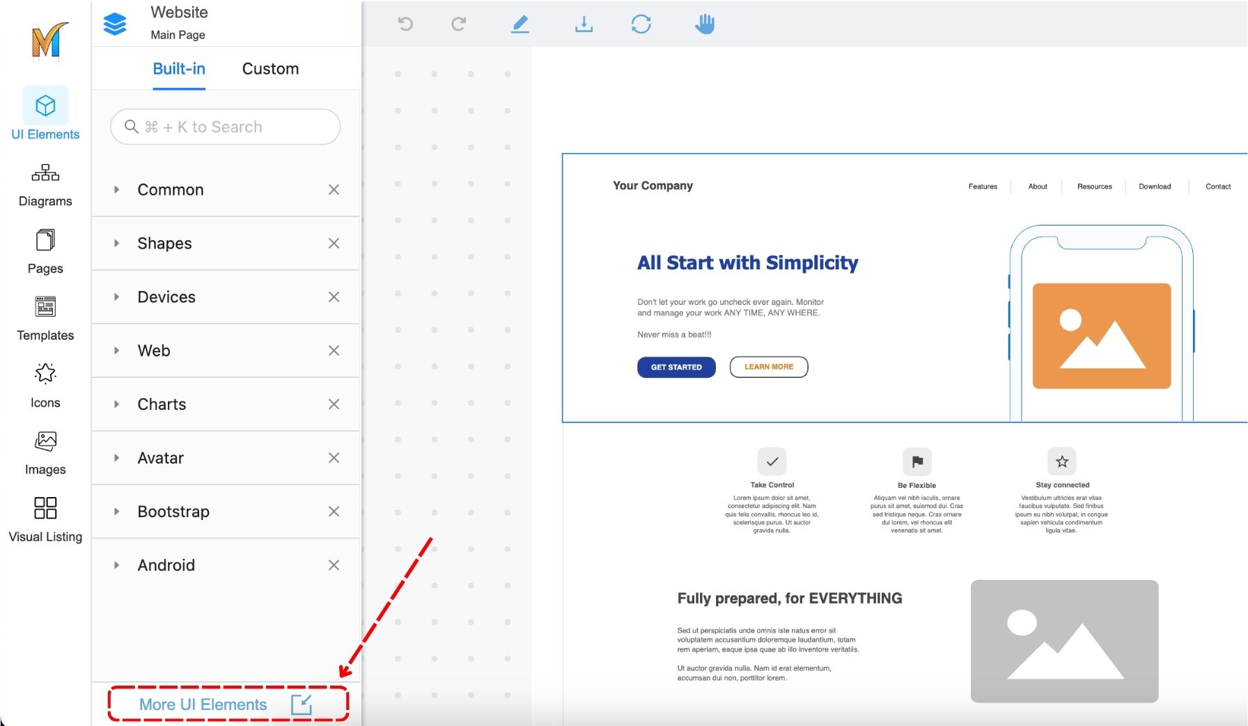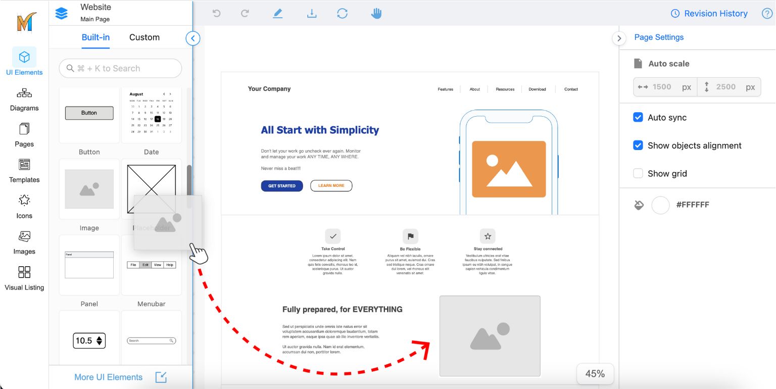 The element library includes a wide range of designed elements, from simple shapes to complex user interfaces.