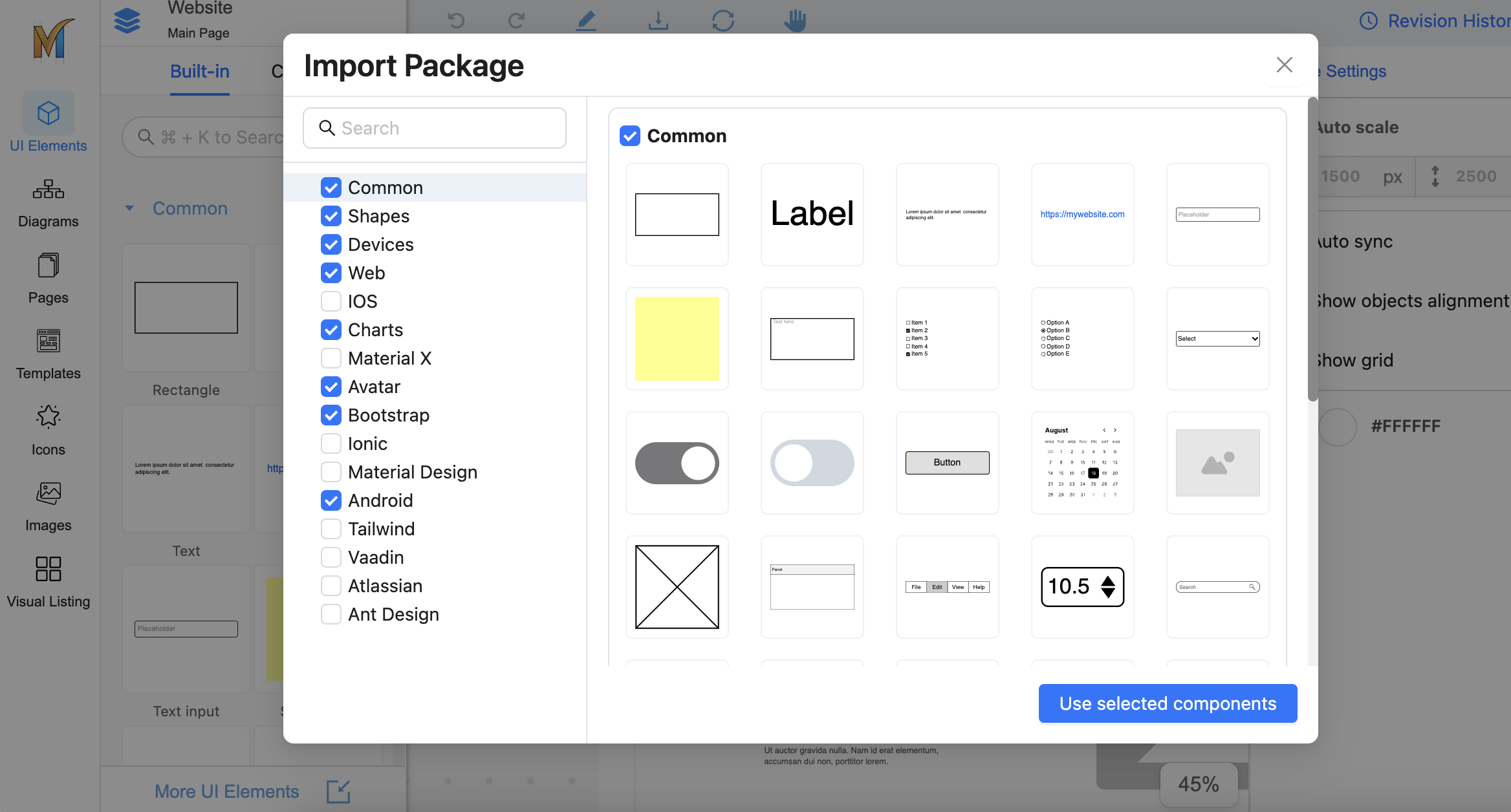 Mocky offers a rich selection of component packages, such as Tailwind, Material Design, and more, that you can import from.