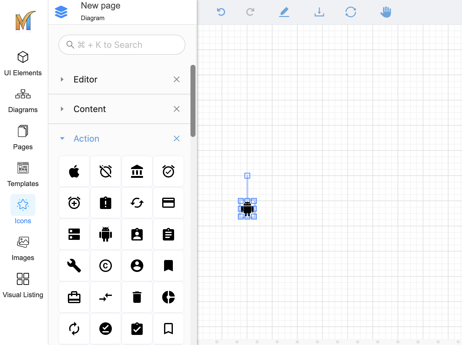 To add an icon to a page, from the Icon library panel, drag and drop that icon onto the page.