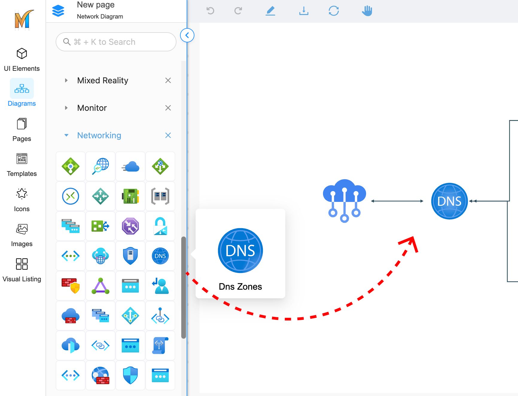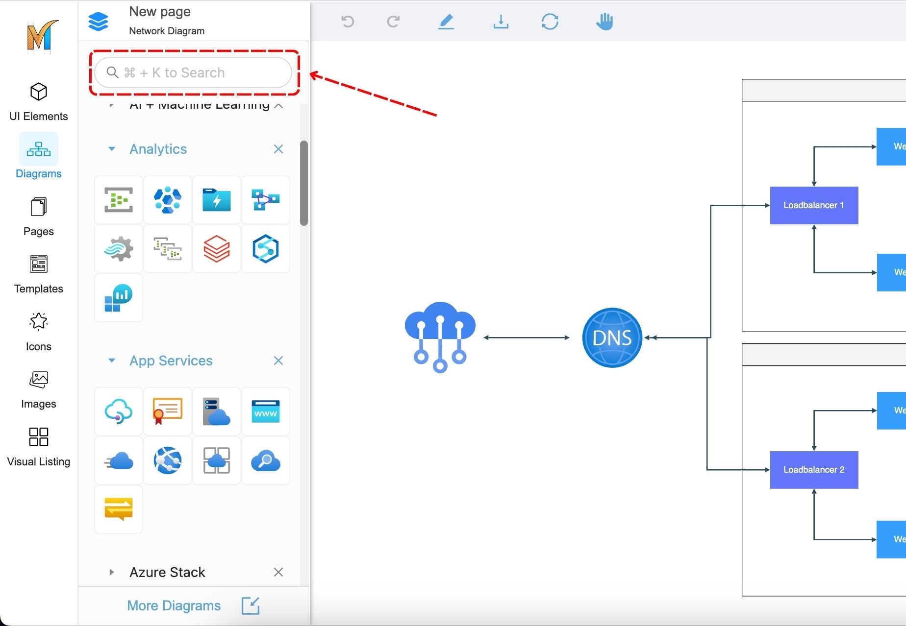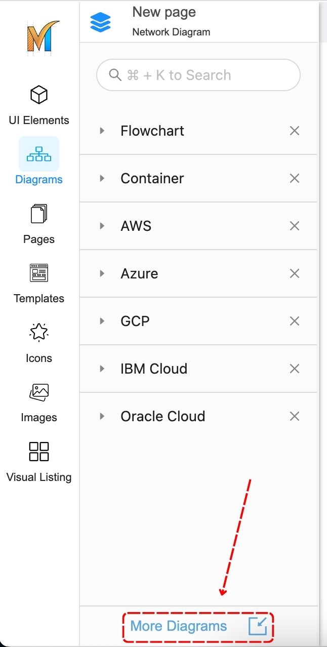 To browse the network library, navigate to the Left Sidebar and click on the Diagrams tab. Then, click on the More Diagrams to import the package.