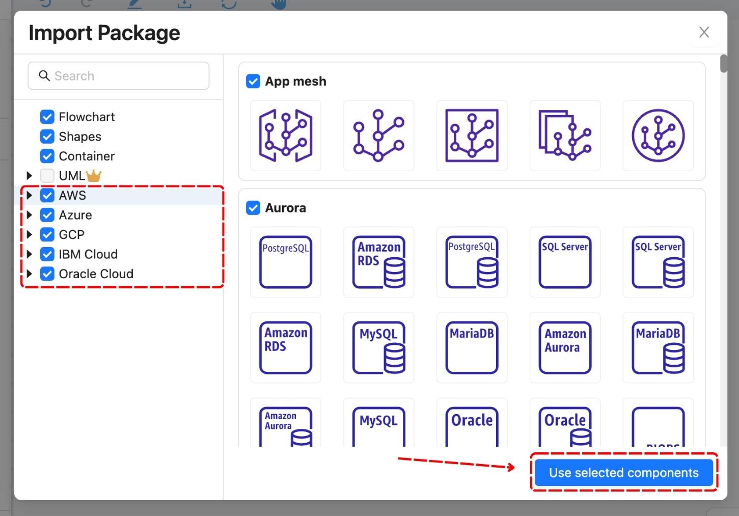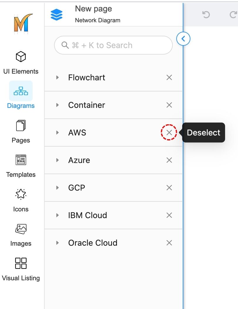 The Network and Cloud elements, including AWS, Azure, GCP, IBM Cloud, and Oracle Cloud, are now located in the Diagrams tab, and you will have to import the package to see them.