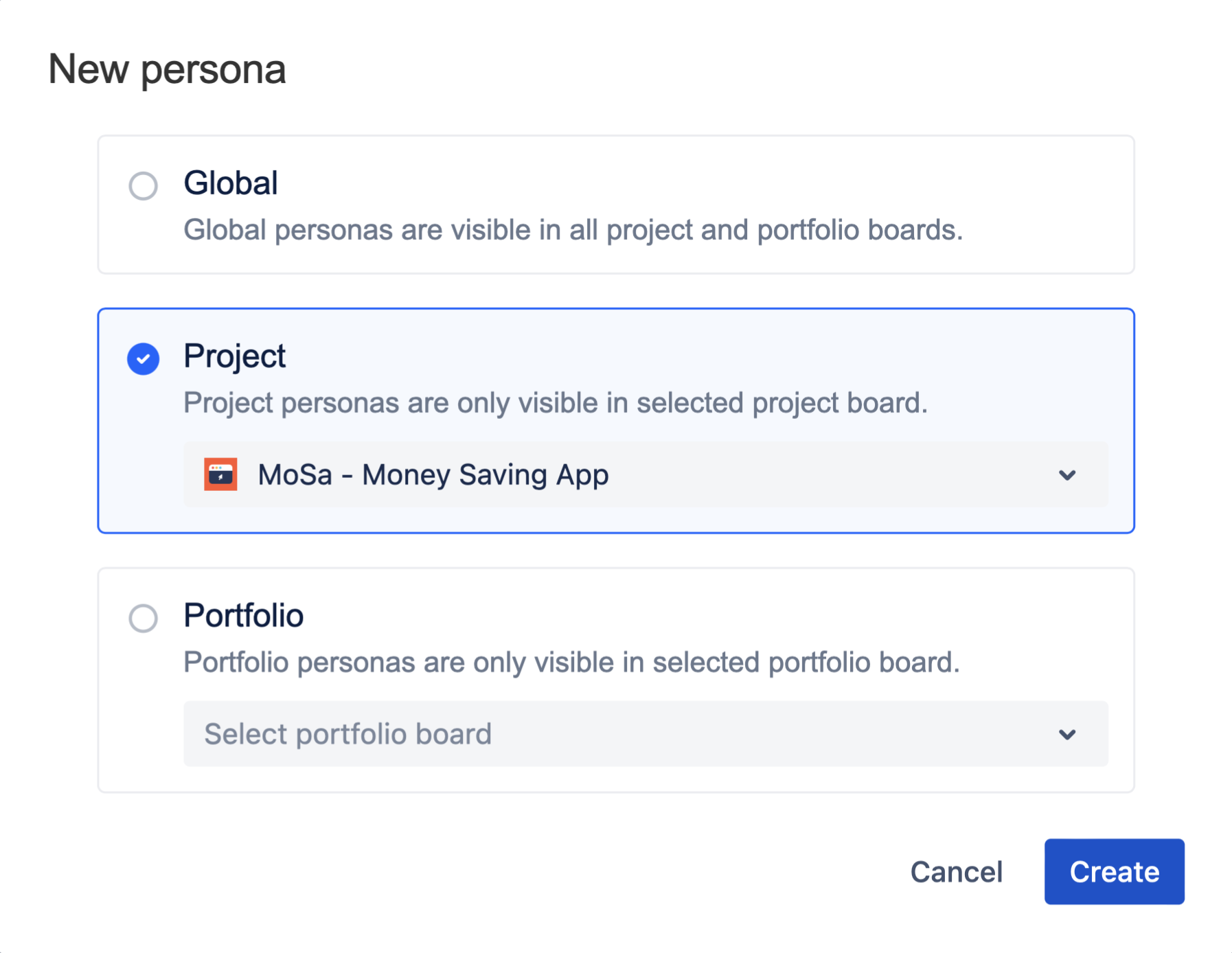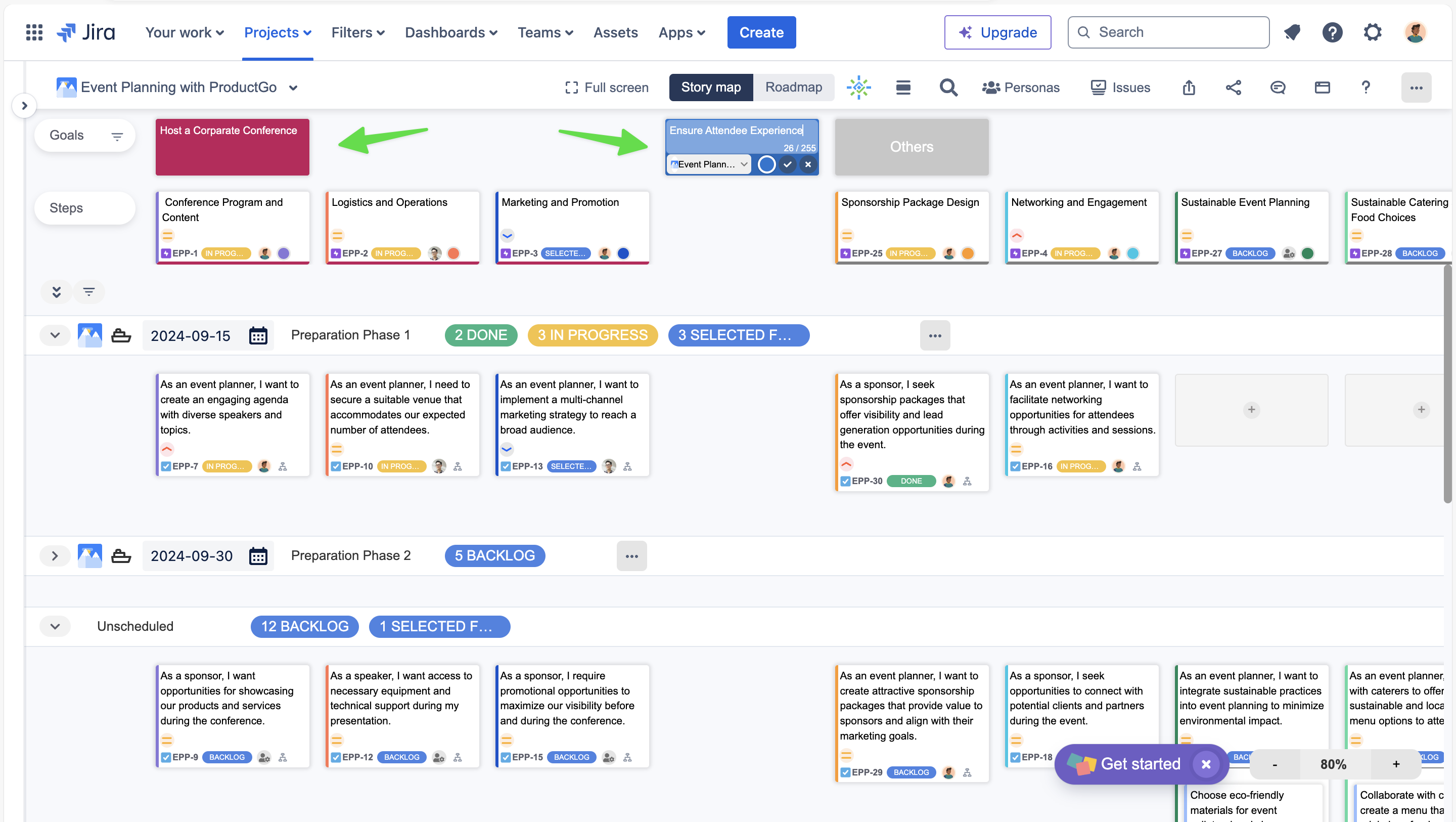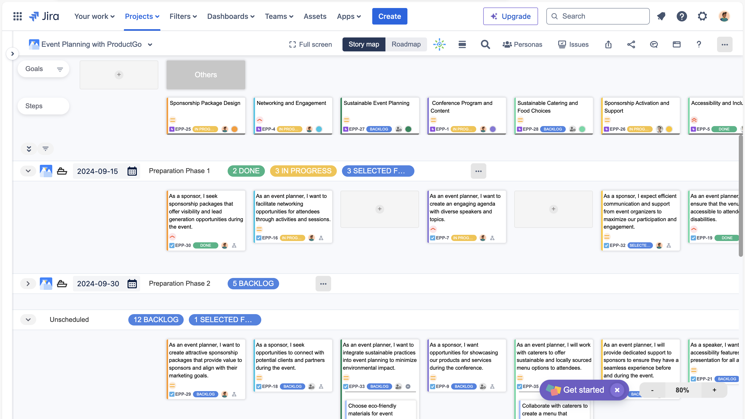 ポートフォリオボード: カスタムポートフォリオボードは柔軟なストーリーマップ作成を提供します。複数のプロジェクトを組み合わせ、プロジェクトごとに複数のボードを作成し、ストーリーマップのレベルを Jira の課題タイプに簡単にマッピングできます。