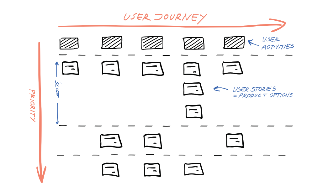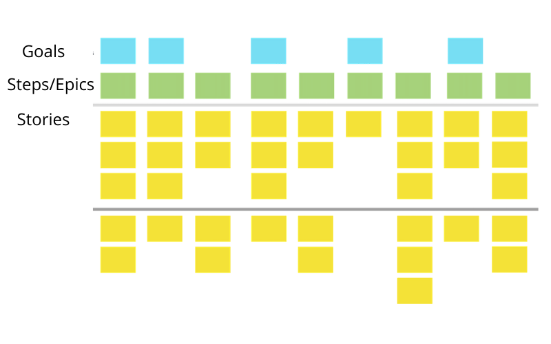 ストーリーマップのバックボーンは、ユーザーがゴールを達成するために通過しなければならない一連のコアステップである。ステップは、ユーザーの旅の物語を構成します。ユーザーがアクティビティを完了するために取る各ステップの中には、ユーザーとそのコンテキストに応じて、ステップを達成するために取ることができる様々なユーザーストーリーの次元が追加されます。