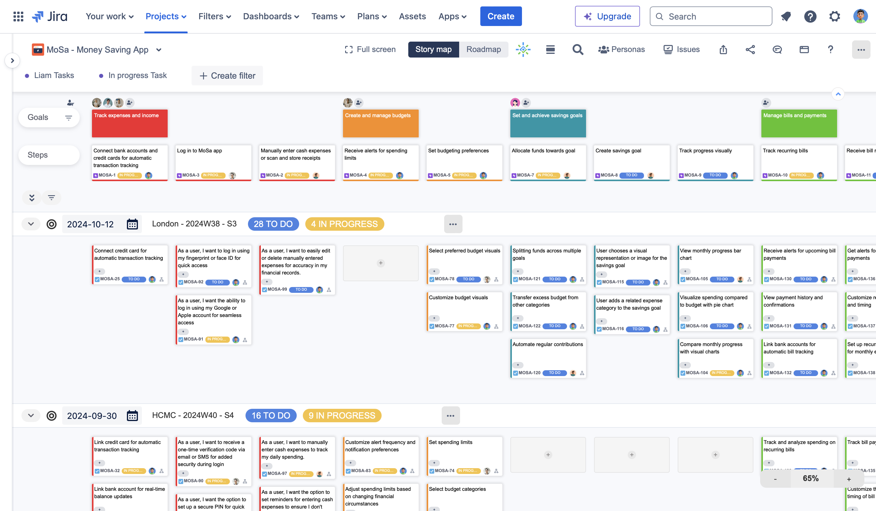 Jira のアジャイル レポートを活用して進捗を追跡し、定期的にストーリーマップを見直します。