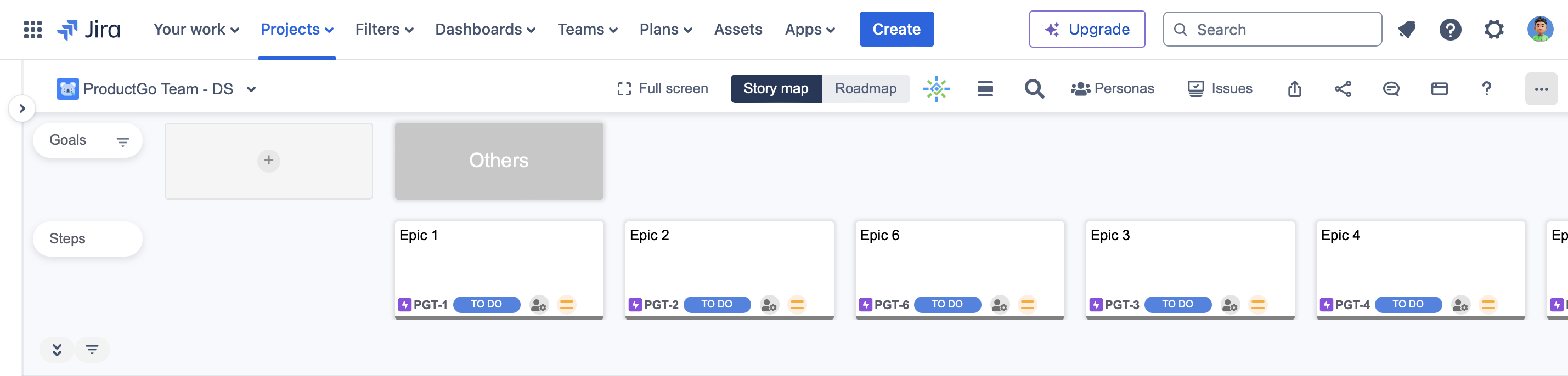 Jira インスタンスのユーザーストーリーマップツールにアクセスし、すべてのエピックを第 2 階層に水平に配置します。