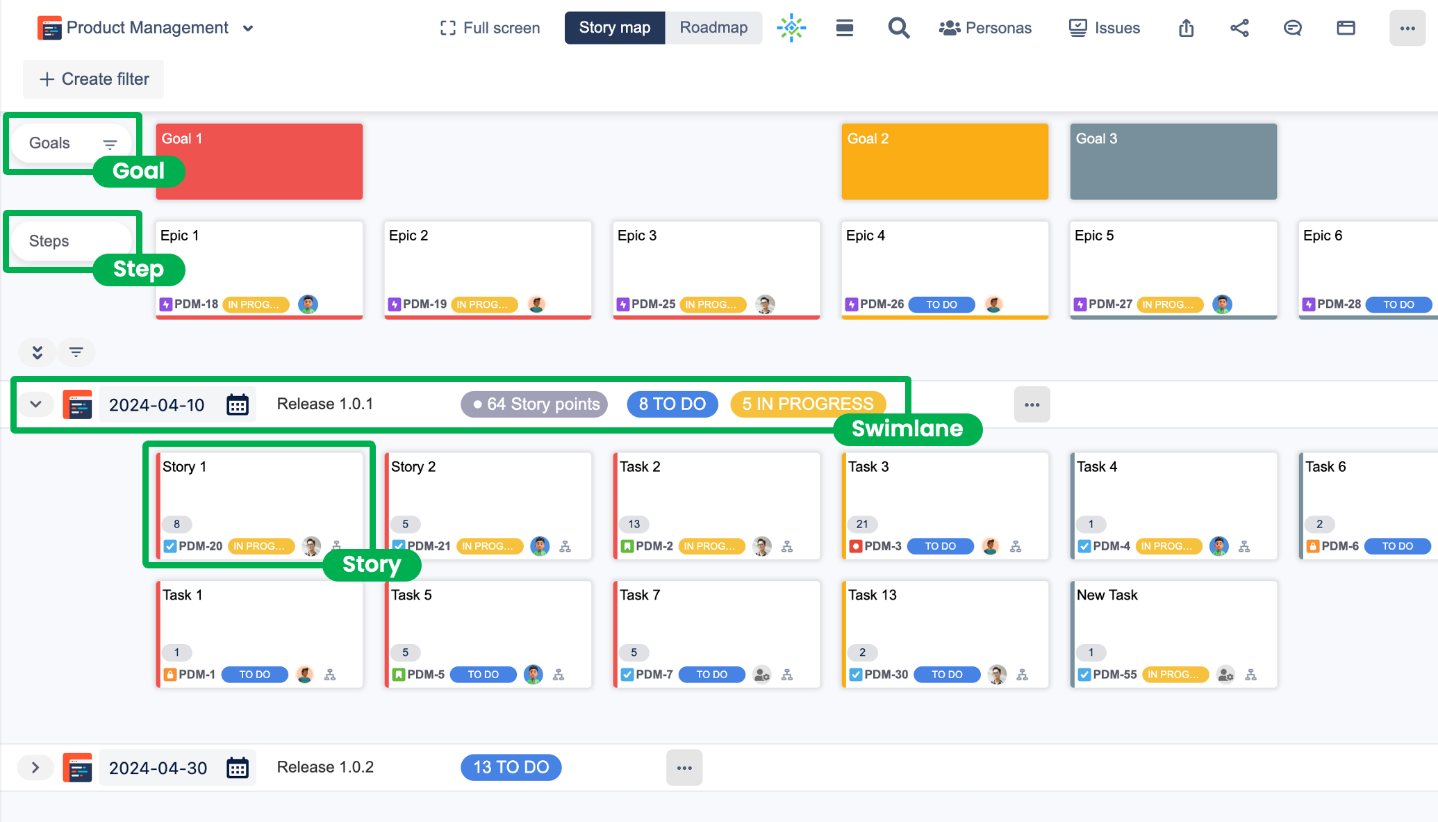 ストーリーマップは基本的に「ゴール」「ステップ」「ストーリー」「スイムレーン」から構成される。ステップはエピックと呼ばれる。