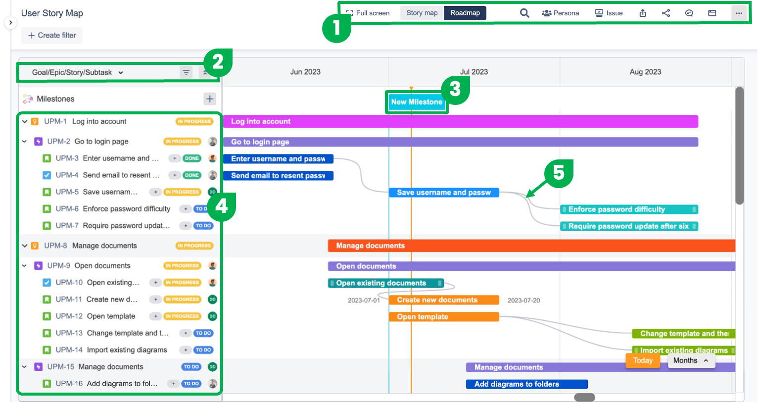 リリース/スプリントまたはゴール/エピック/ストーリー/サブタスクごとにマイルストーンがアーカイブされたロードマップを表示します。マイルストーン:
