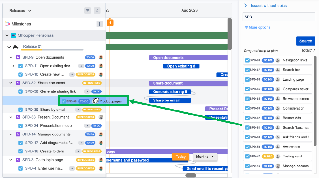 ユーザーはまた、エピックのない課題をロードマップに直接ドラッグ・アンド・ドロップすることもできます。