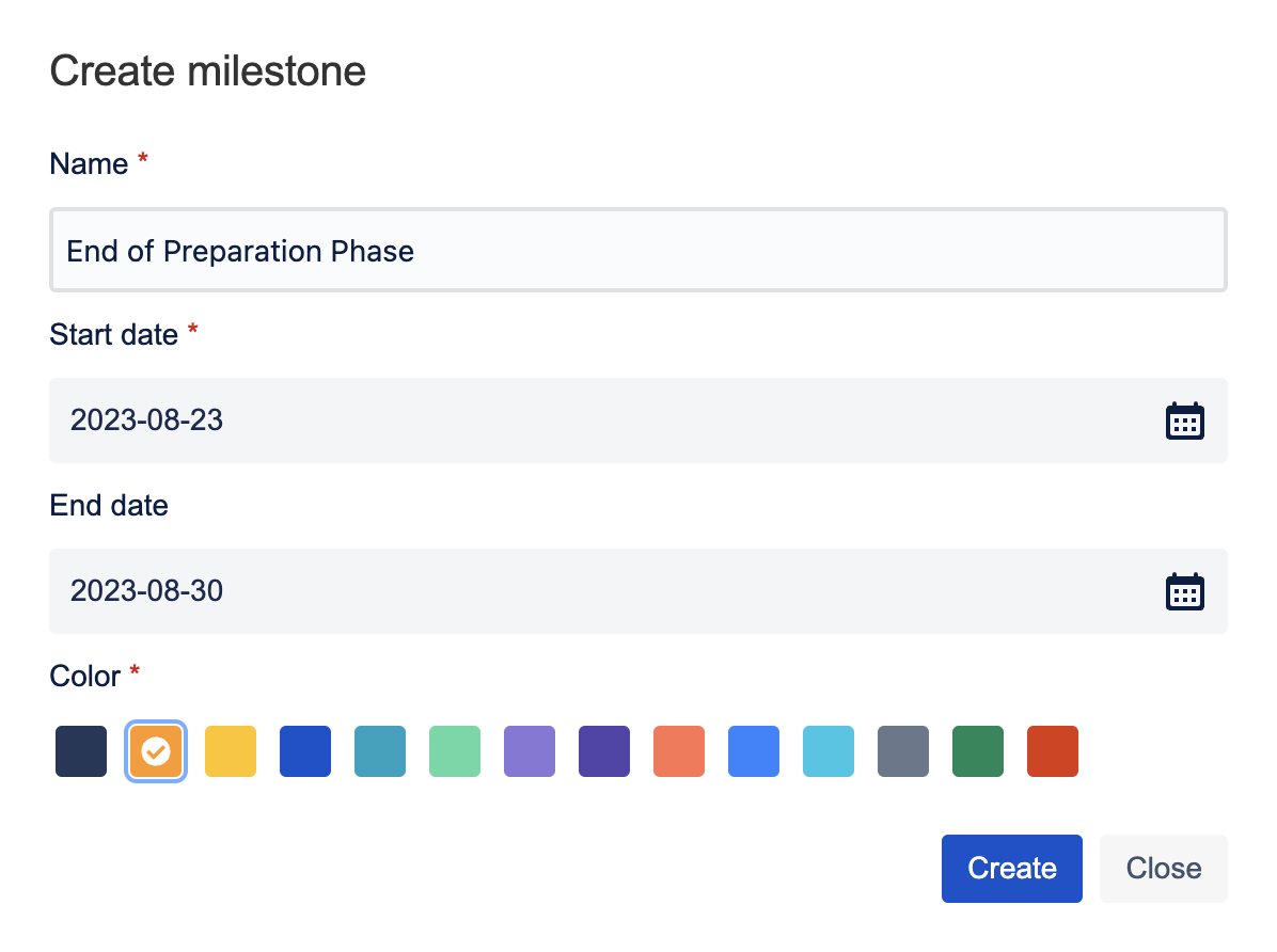 クリックすると、新しいマイルストーンを作成するためのエディタダイアログが開きます。ここで、新しいマイルストーンを作成するための詳細を追加します。